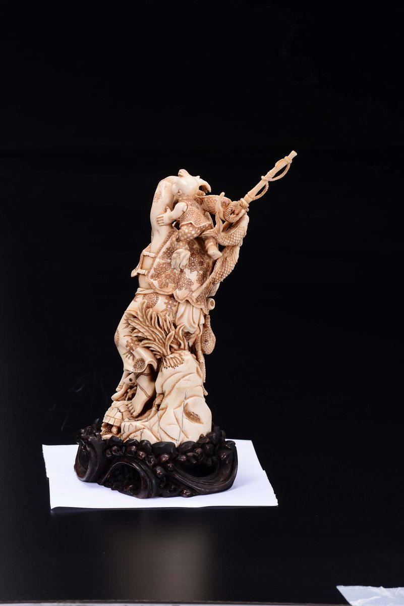 Figura di pescatore scolpito in avorio con canna da pesca e fanciullo sulle spalle, Cina, Dinastia Qing, fine XIX secolo