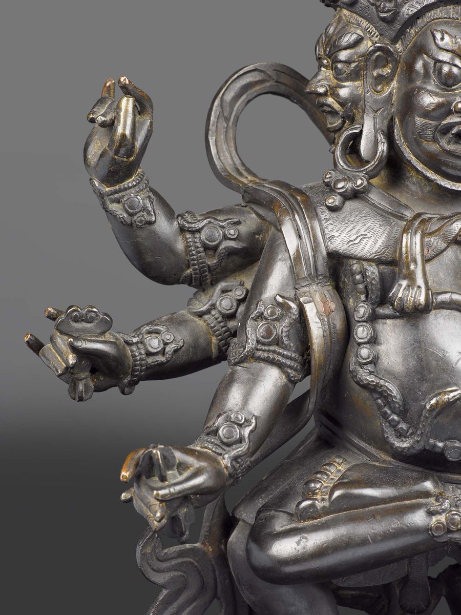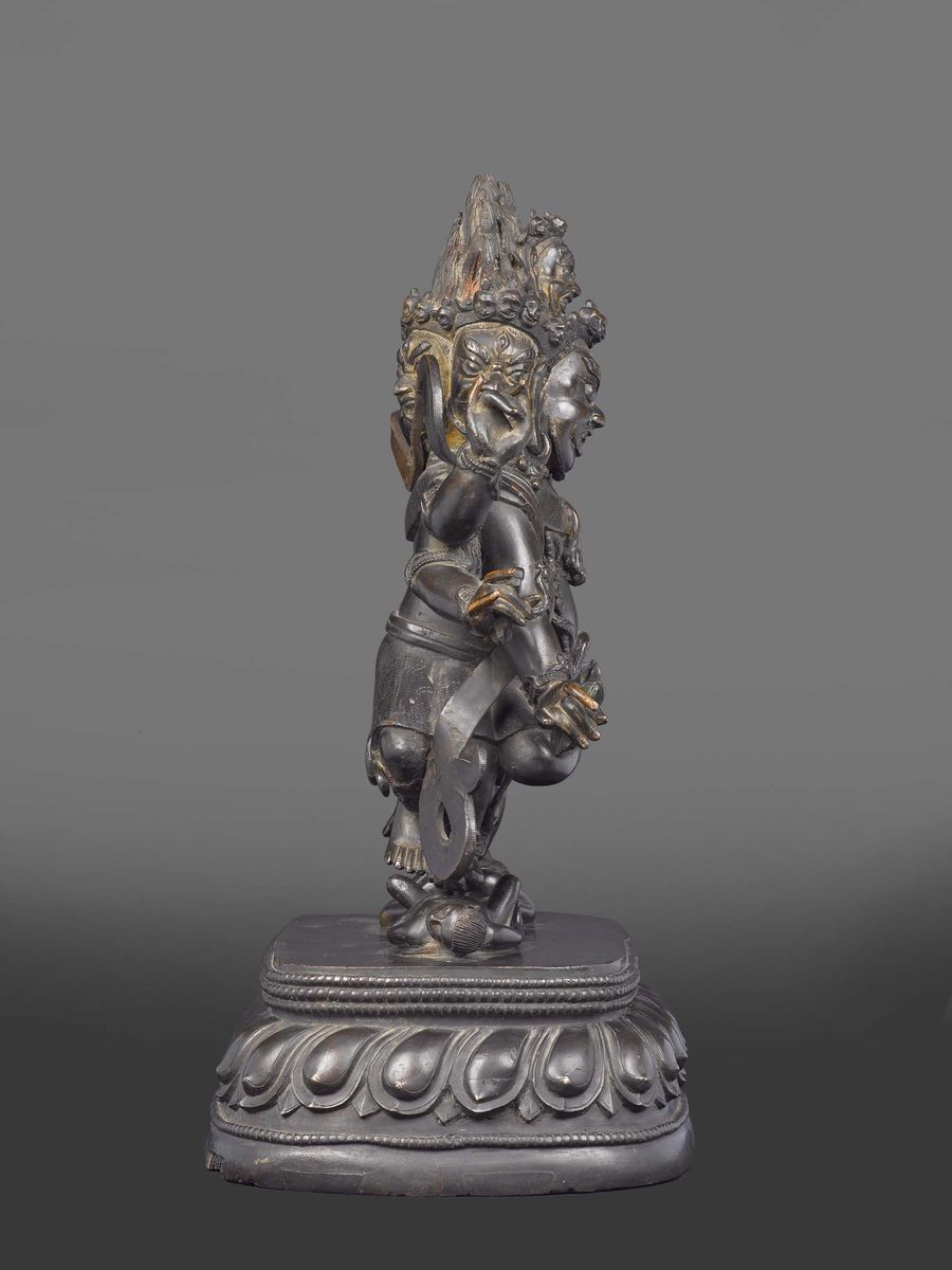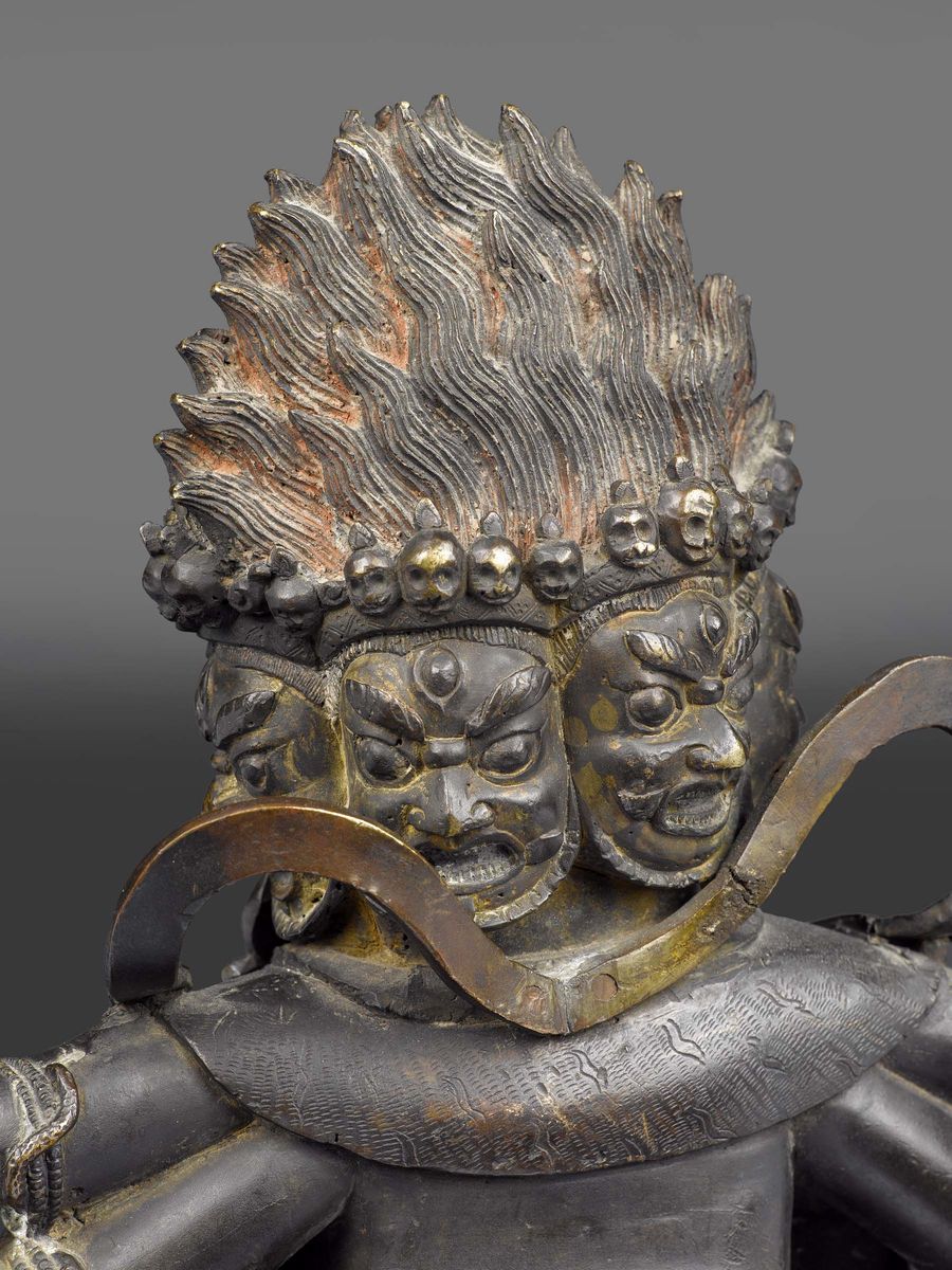 Grande ed importante figura di Mahakala a più teste con oggetti rituali tra le mani sopra fiore di loto, Cina, Dinastia [..]