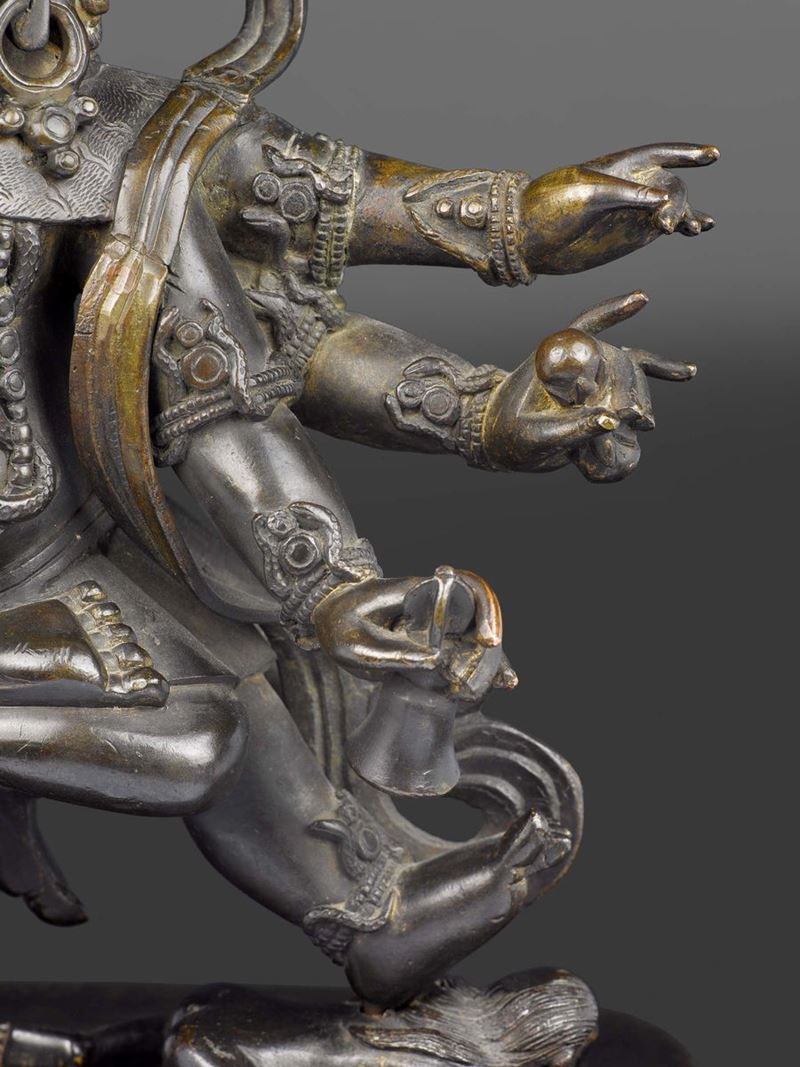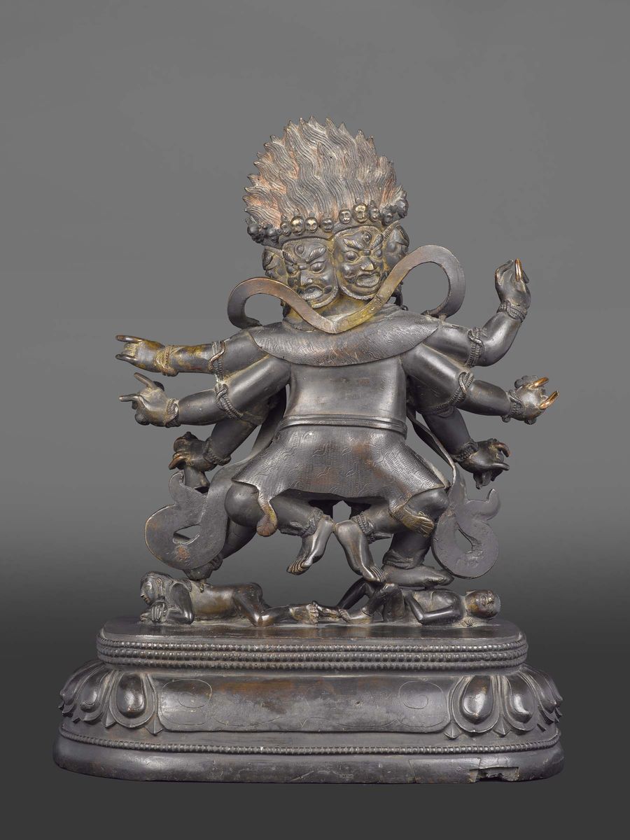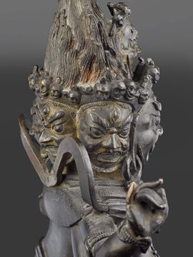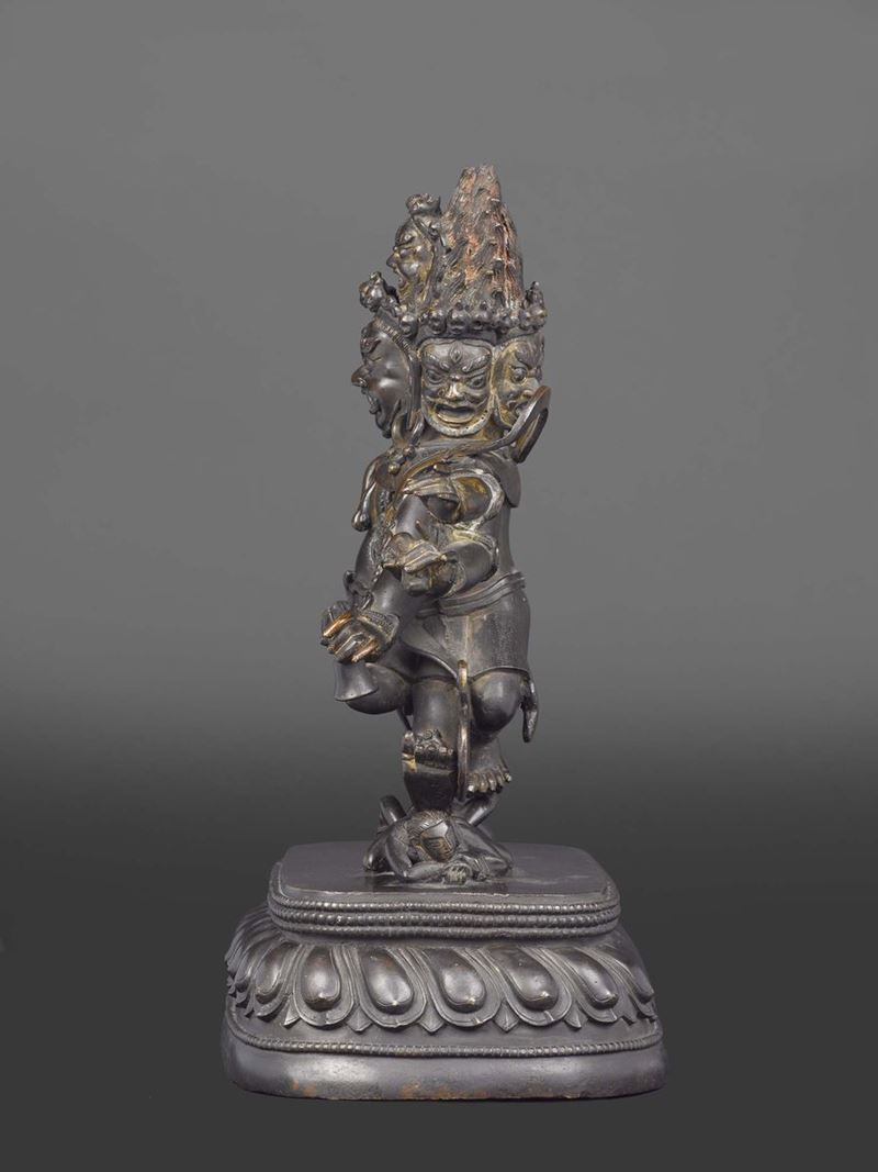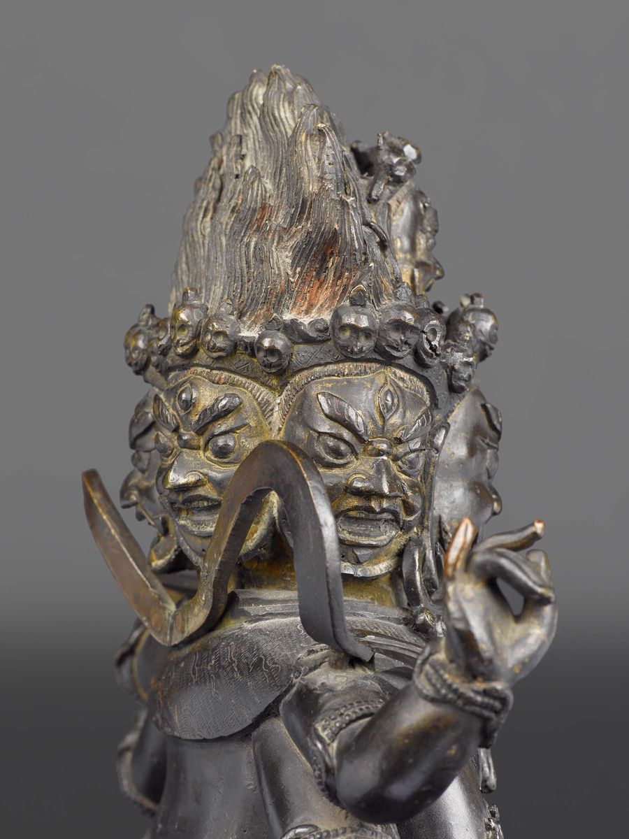Grande ed importante figura di Mahakala a più teste con oggetti rituali tra le mani sopra fiore di loto, Cina, Dinastia [..]
