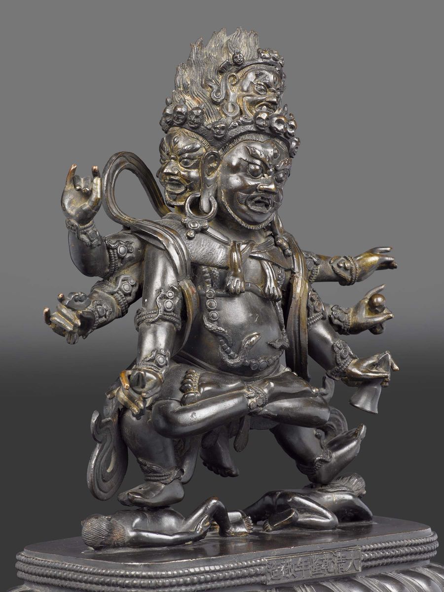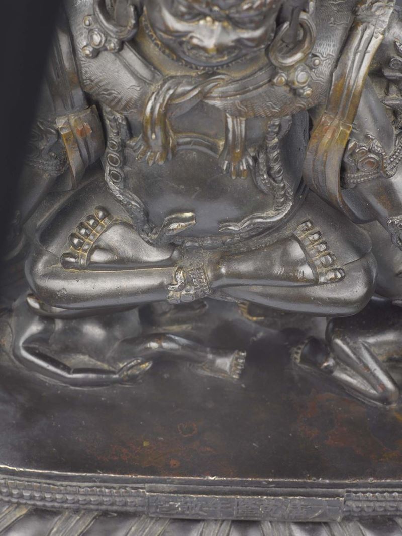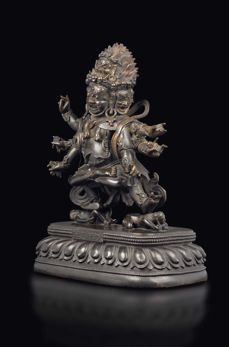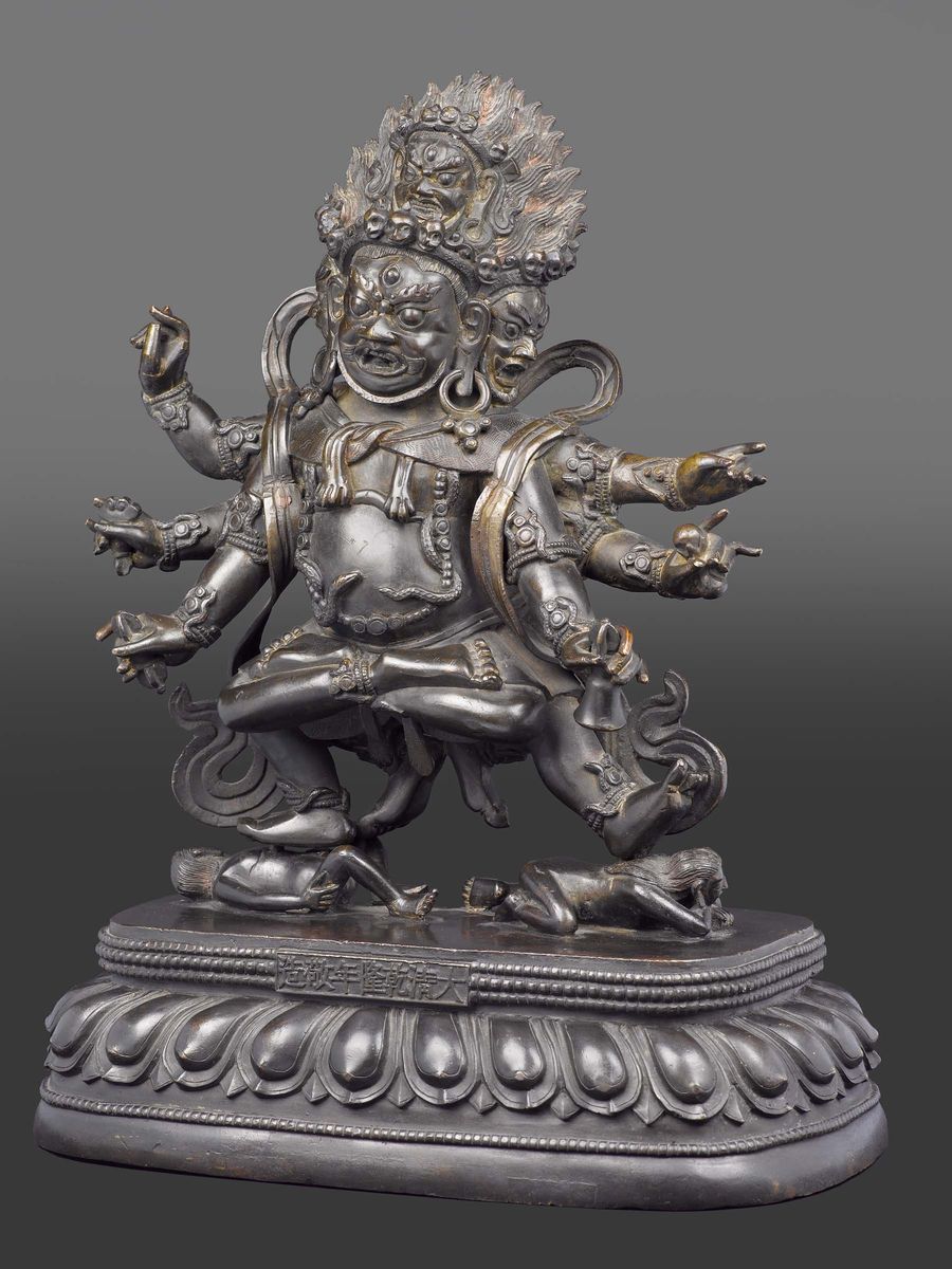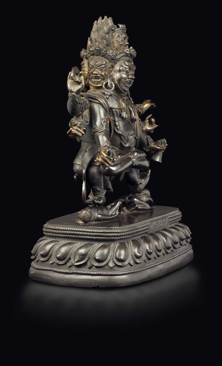 Grande ed importante figura di Mahakala a più teste con oggetti rituali tra le mani sopra fiore di loto, Cina, Dinastia Qing, marca e del periodo Qianlong (1736-1795)