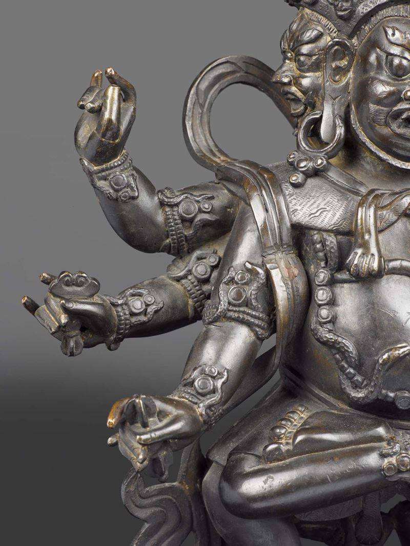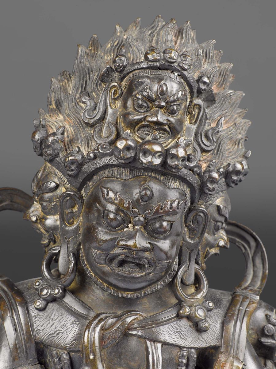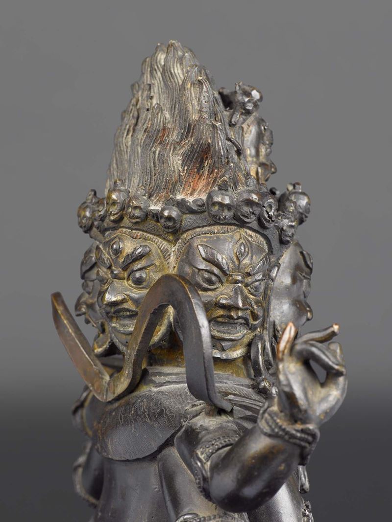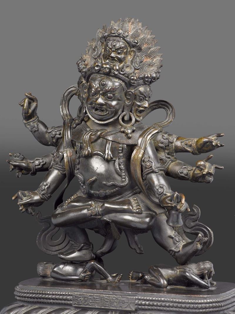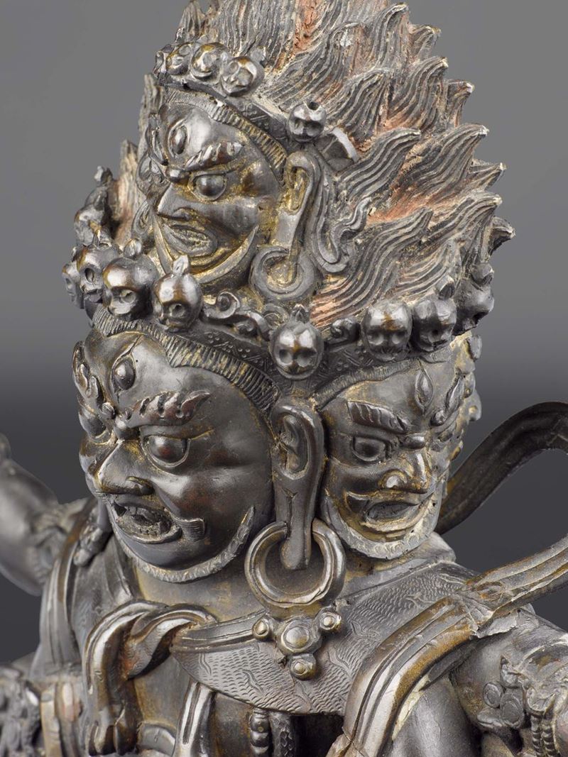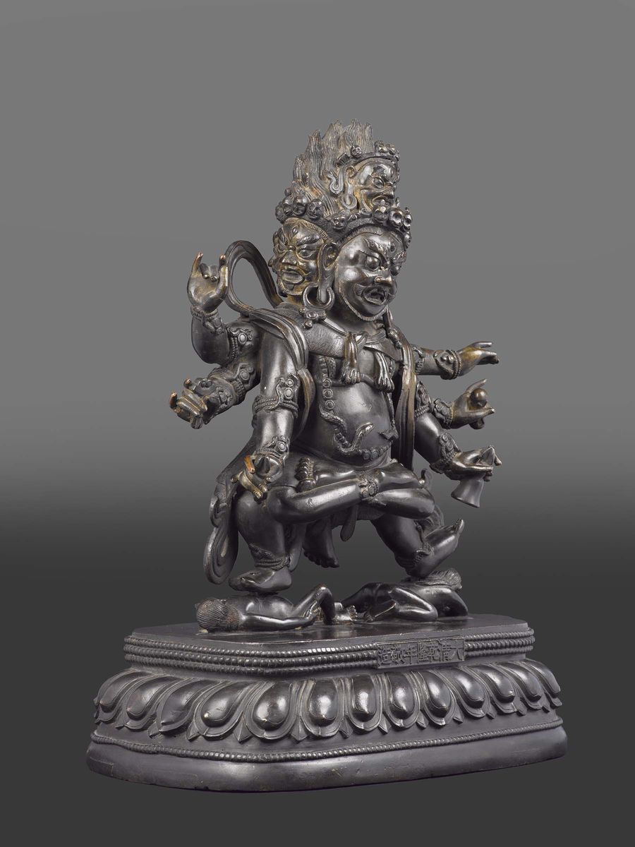 Grande ed importante figura di Mahakala a più teste con oggetti rituali tra le mani sopra fiore di loto, Cina, Dinastia Qing, marca e del periodo Qianlong (1736-1795)