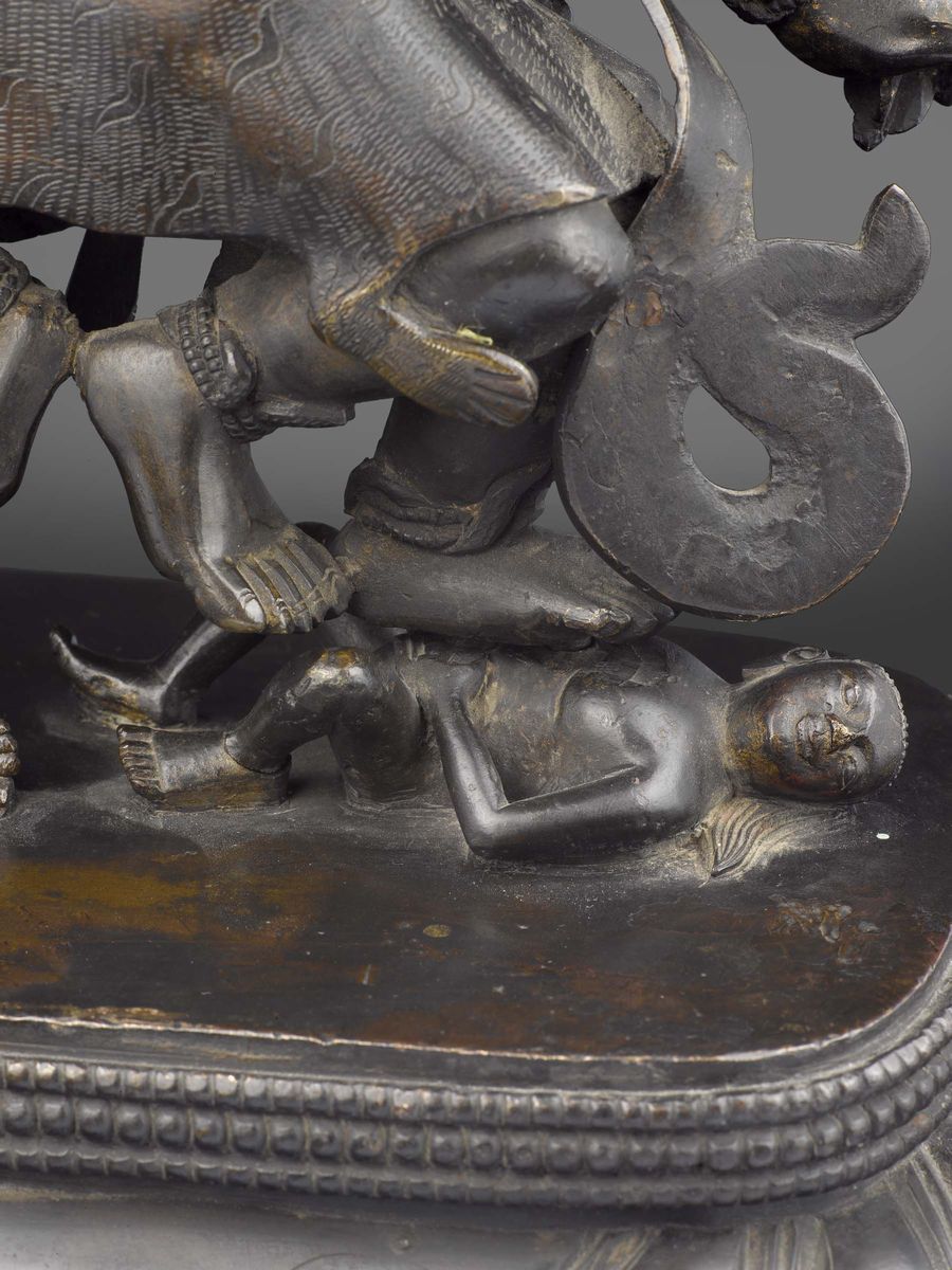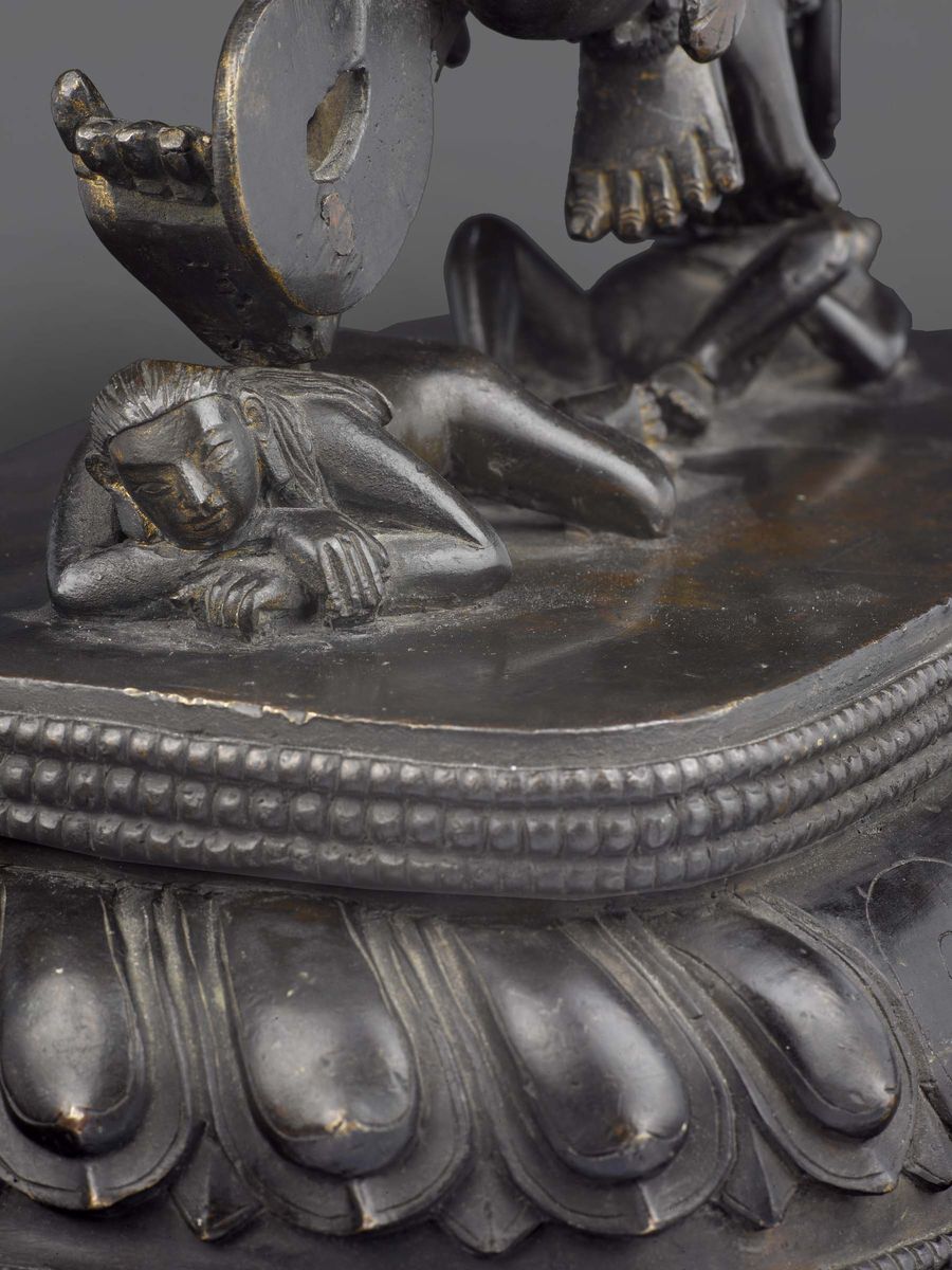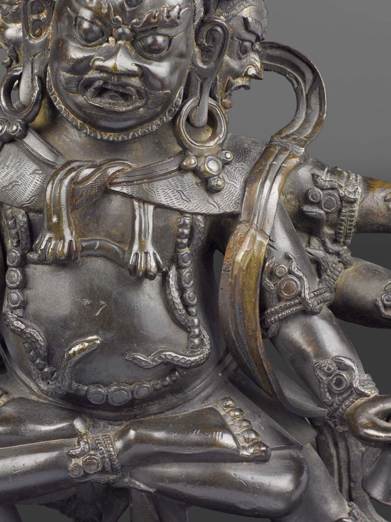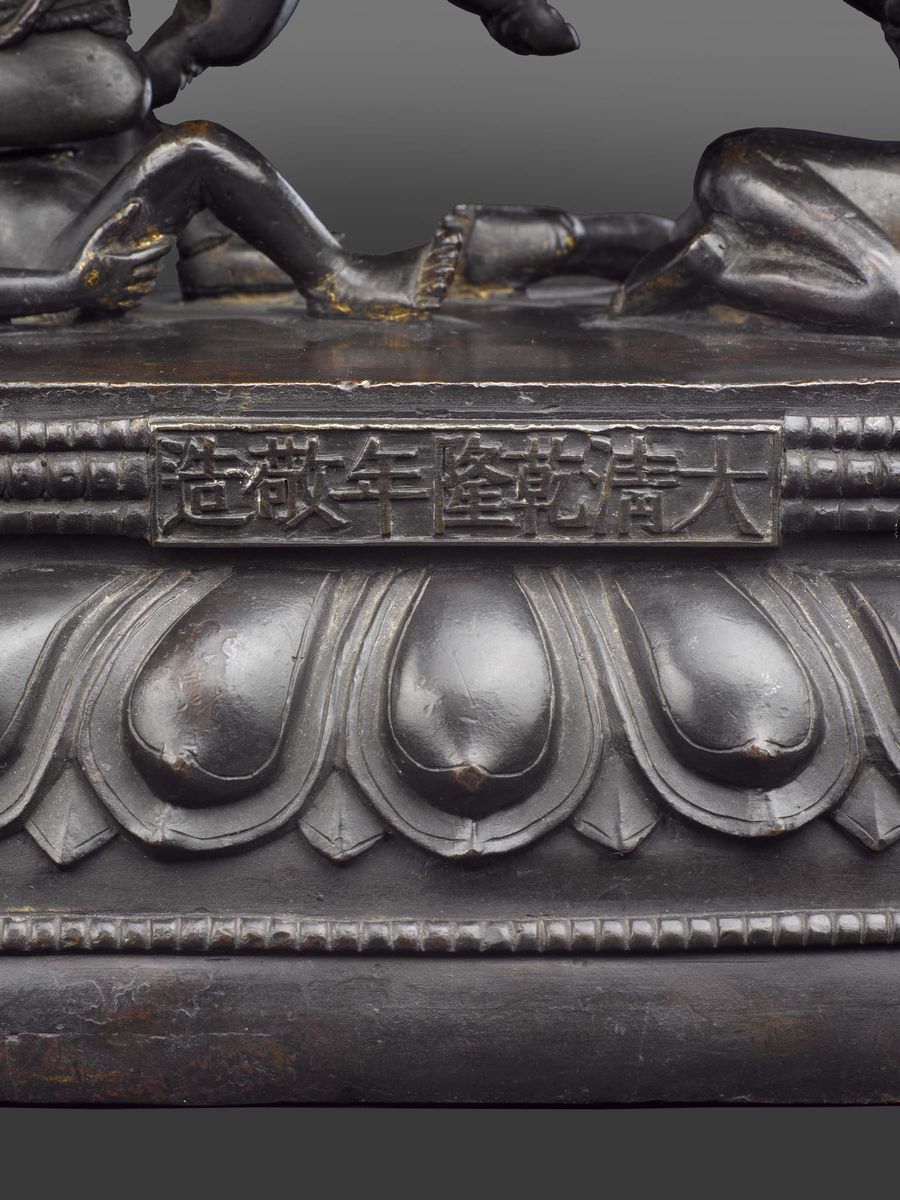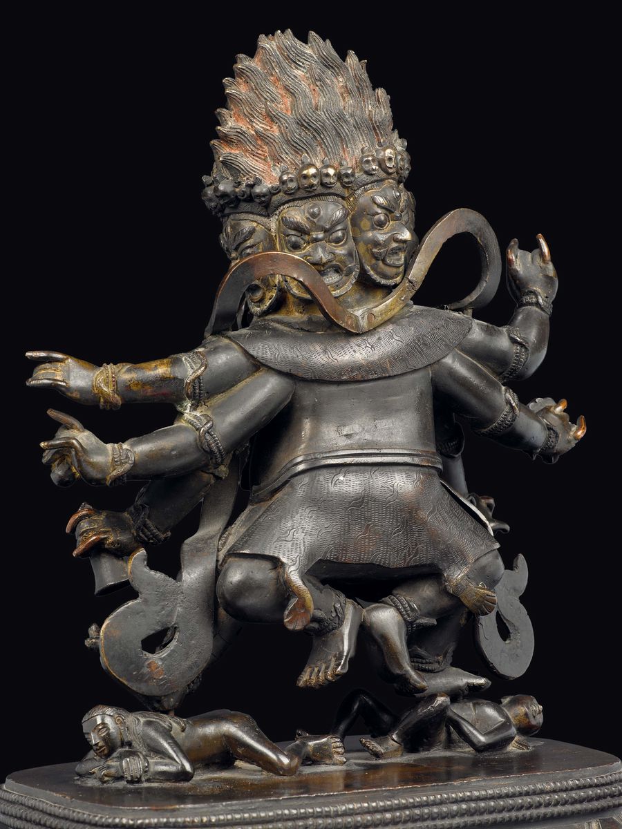 Grande ed importante figura di Mahakala a più teste con oggetti rituali tra le mani sopra fiore di loto, Cina, Dinastia Qing, marca e del periodo Qianlong (1736-1795)