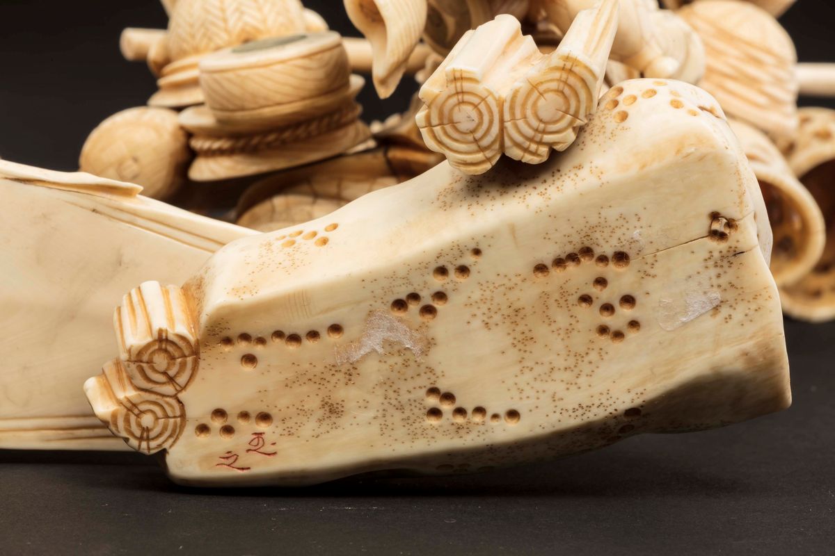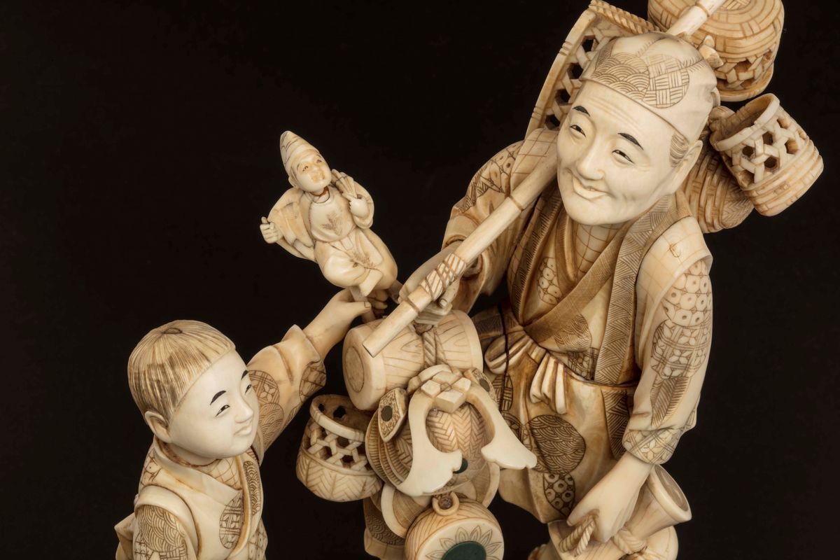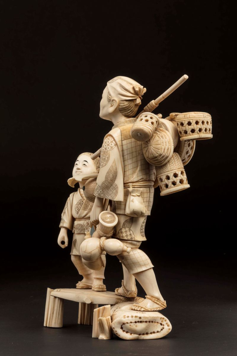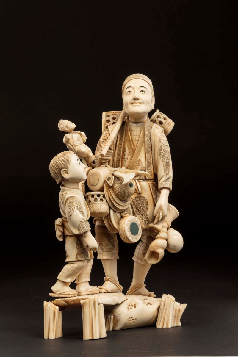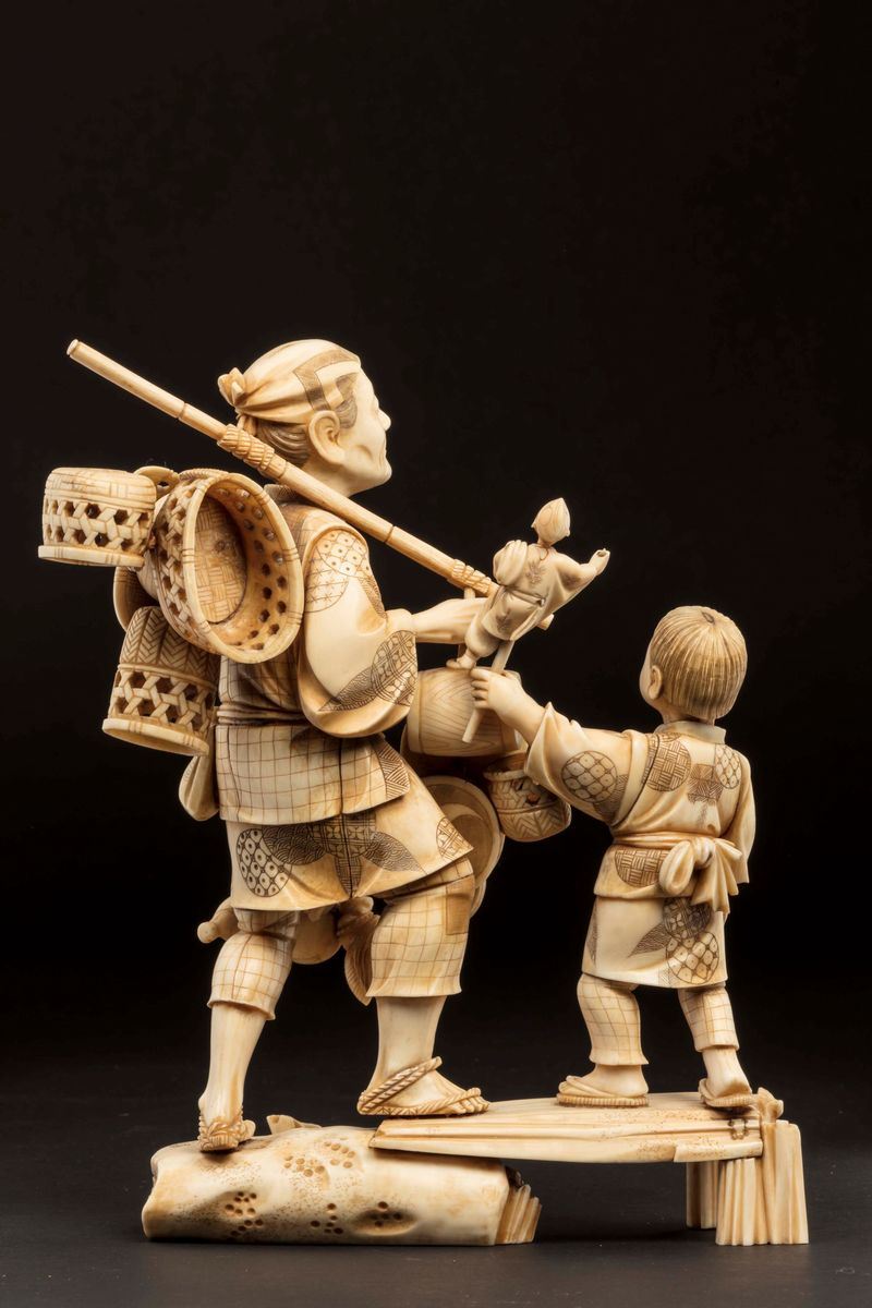 Grande gruppo in avorio raffigurante contadino con bambini, Giappone, inizio XX secolo