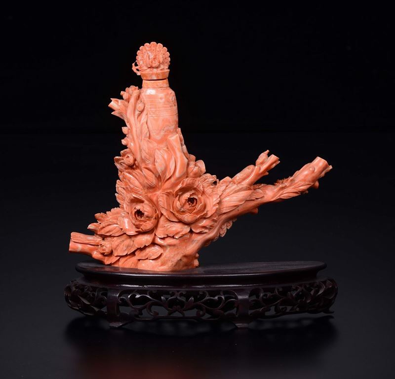 Gruppo scolpito in corallo raffigurante pavoni con vaso, Cina, inizio XX secolo