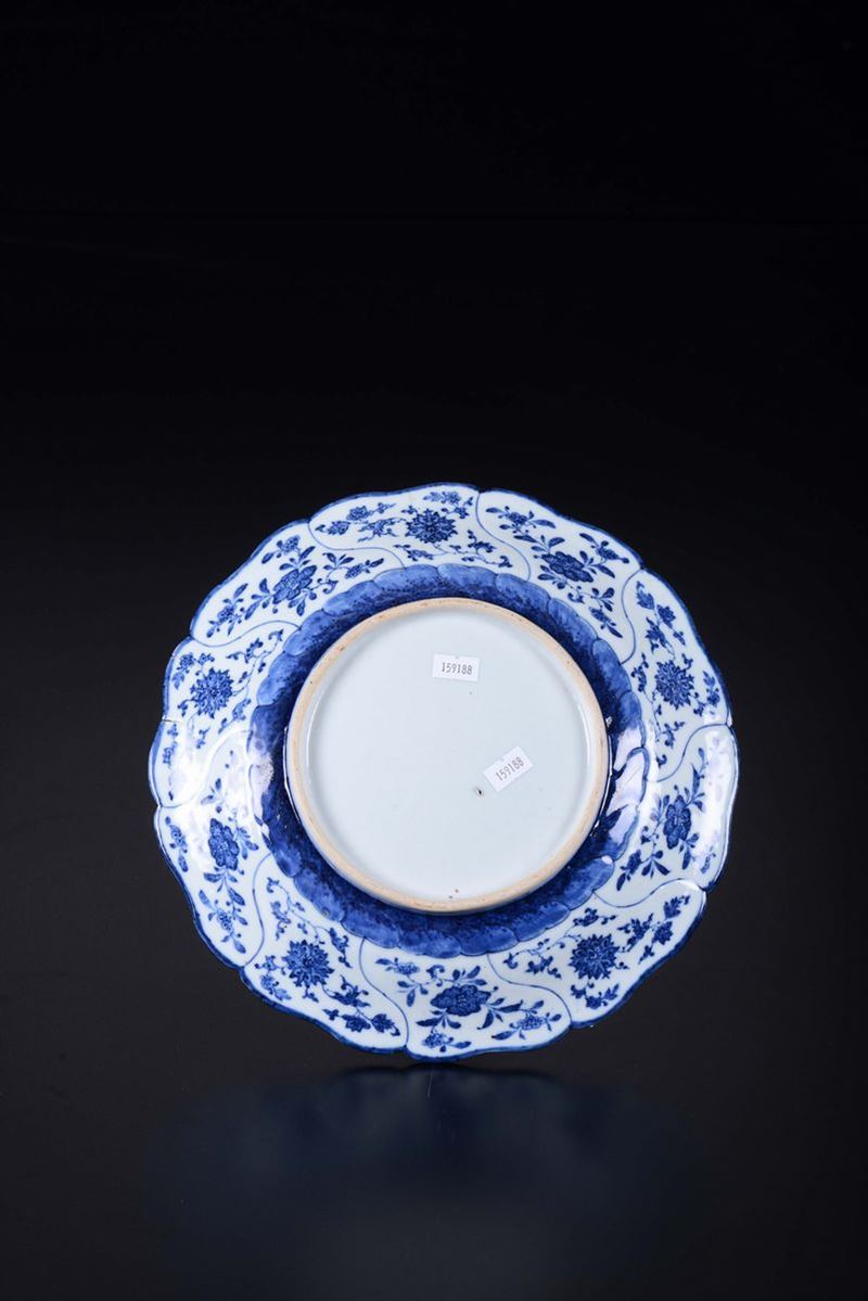 Piatto in porcellana bianca e blu a decoro floreale d’ispirazione Ming, Cina, Dinastia Qing, XVIII secolo