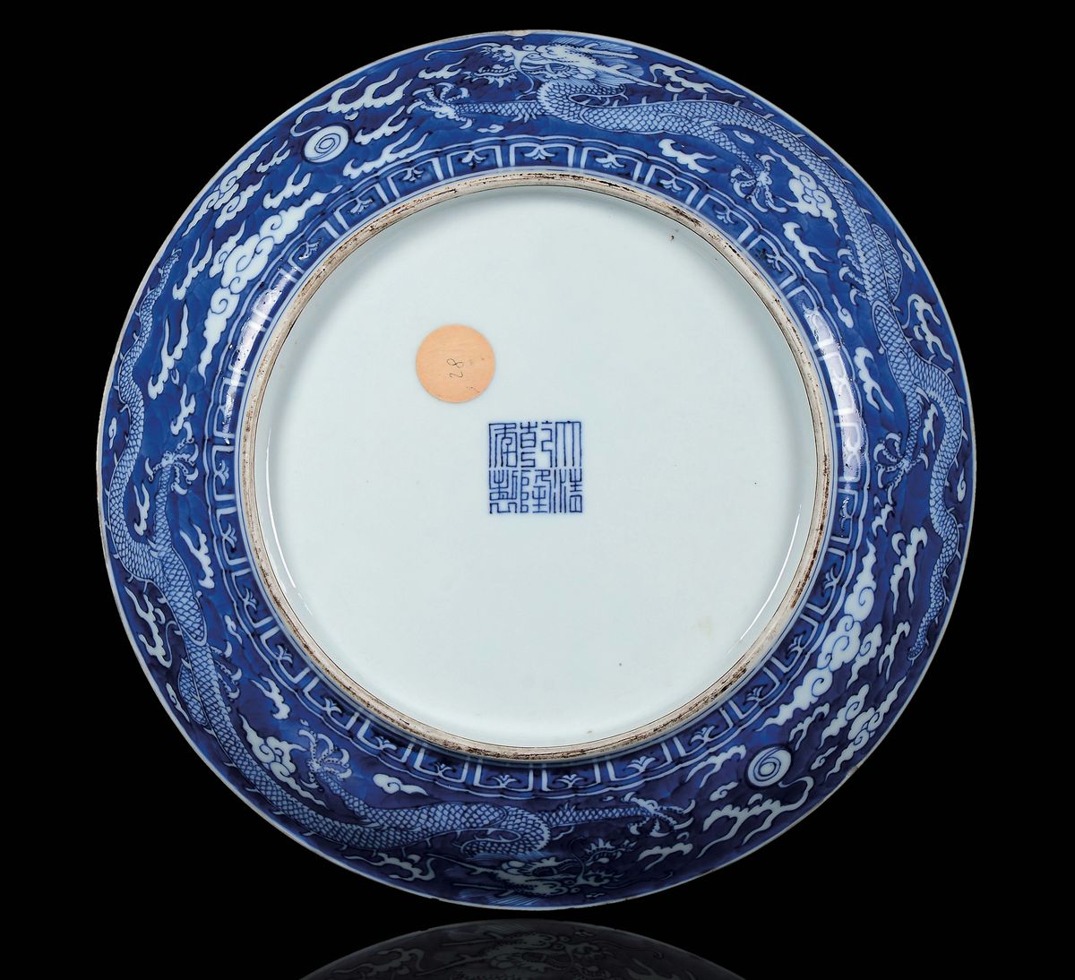 Piatto in porcellana bianca e blu con decoro di draghi tra le nuvole, Cina, Dinastia Qing, marchio e del periodo Qianlong [..]