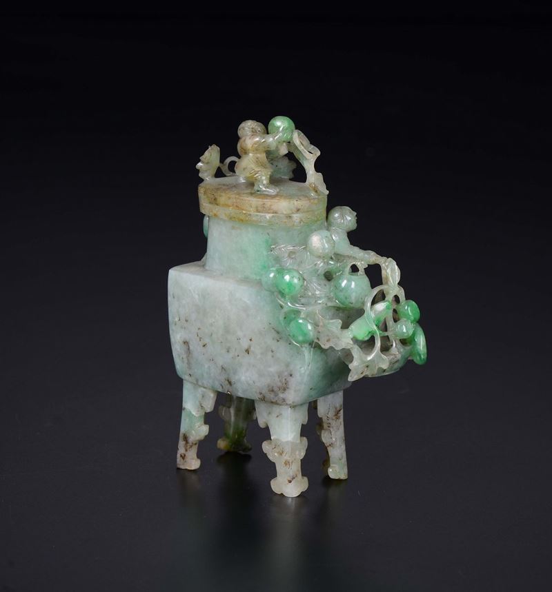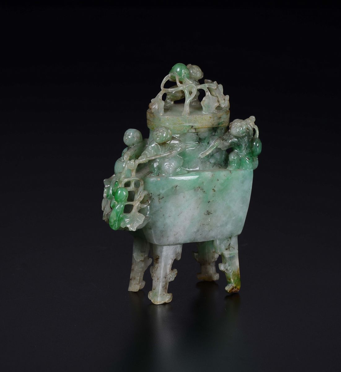 Piccolo incensiere con coperchio in giadeite e sfumature verde mela con fanciulli e frutti a rilievo, Cina, inizio XX sec [..]