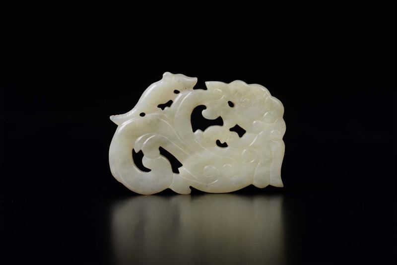 Placca in giada bianca con intaglio a traforo raffigurante animale fantastico con topolino, Cina, Dinastia Qing, XIX seco [..]