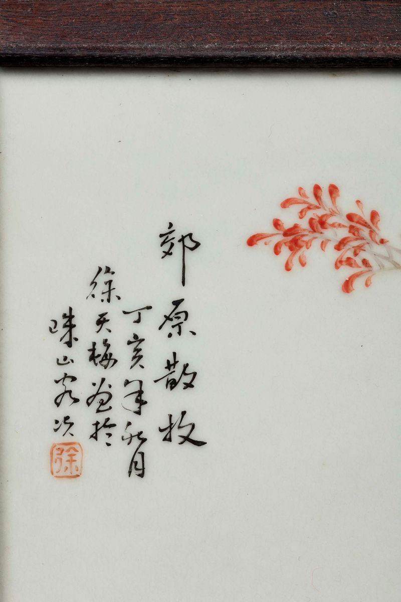 Placca in porcellana a smalti policromi raffigurante bufalo con iscrizione, Cina, Repubblica, XX secolo