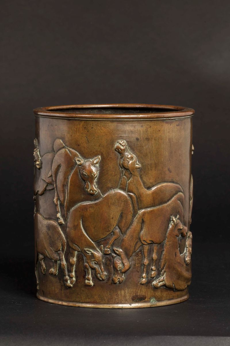 Portapennelli in bronzo con gruppo di cavalli a rilievo, Cina, Dinastia Qing, XVIII secolo