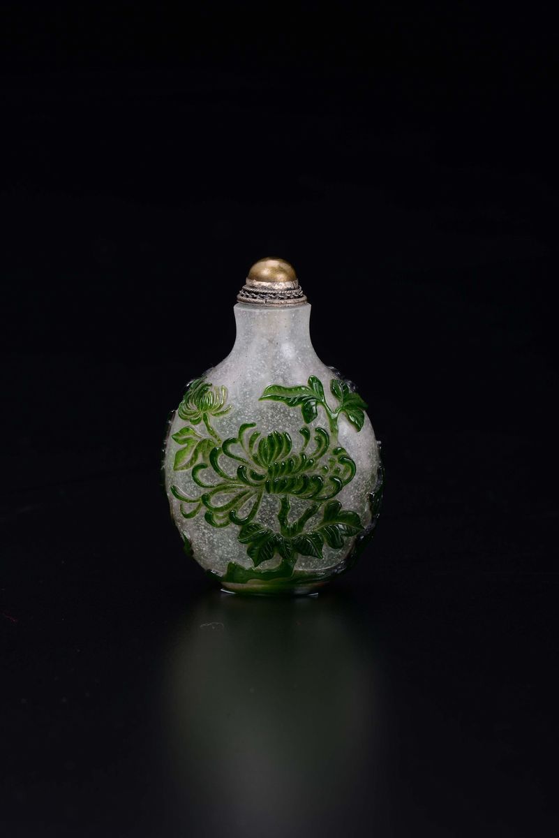 Snuff bottle in vetro inciso con personaggi e fiore di loto, Cina, Dinastia Qing, XIX secolo