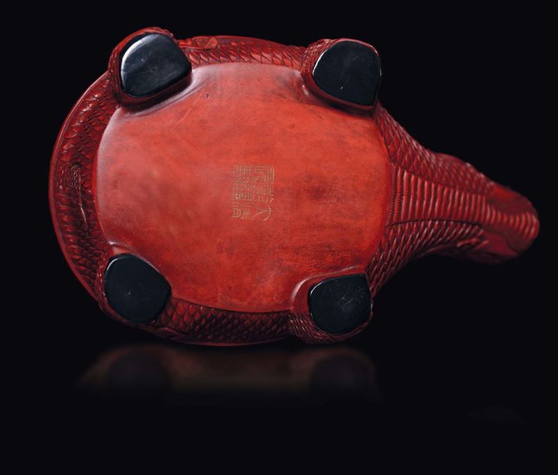 Una teiera in terracotta Yixing e lacca rossa ed una scatola a guisa di tartaruga in lacca rossa con marchio Qianlong, Cina, [..]