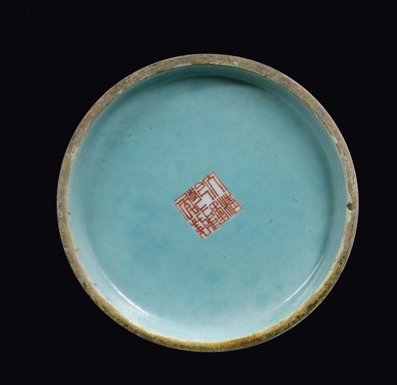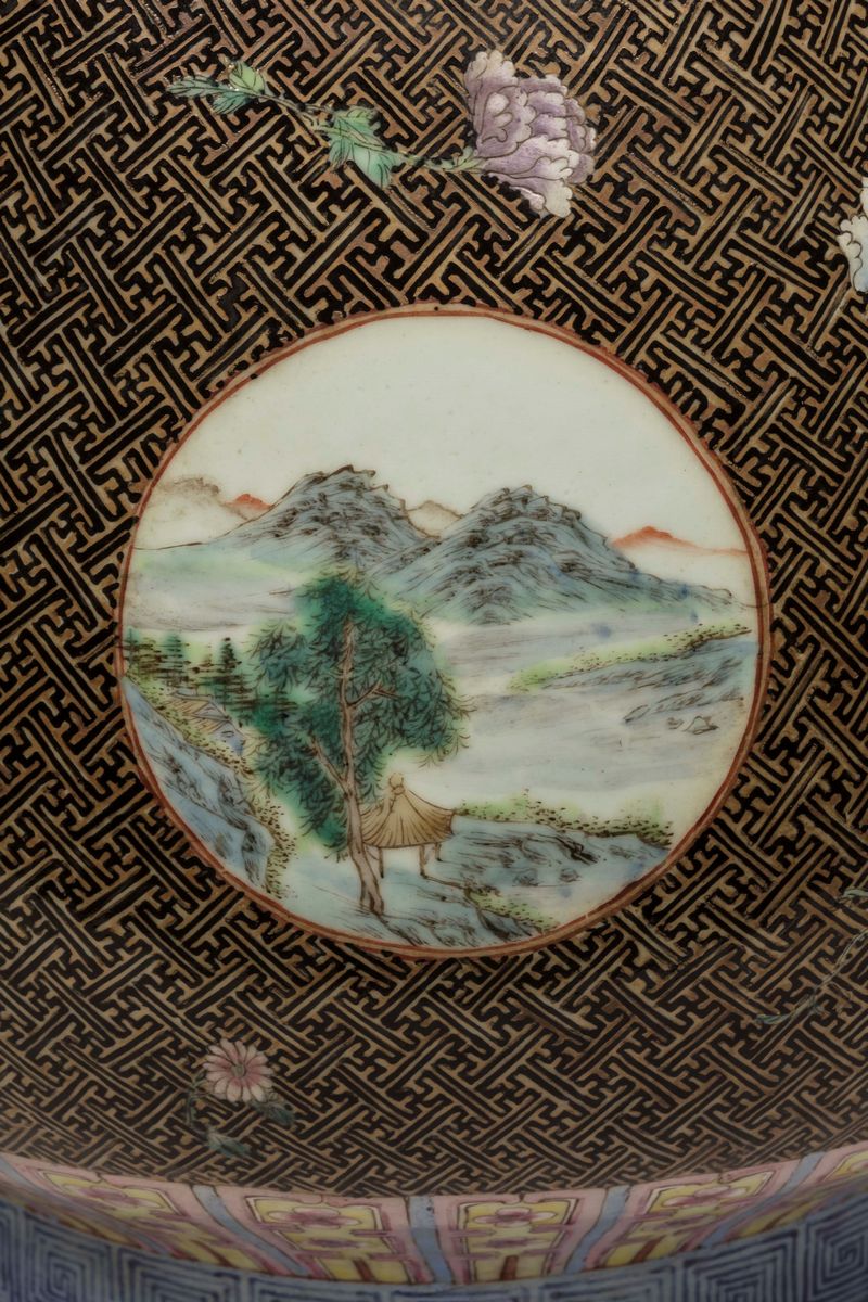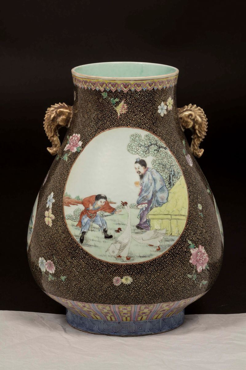 Vaso in porcellana a smalti policromi a doppia ansa con riserve raffiguranti attendenti e fanciulli con oche, Cina, Dinastia [..]