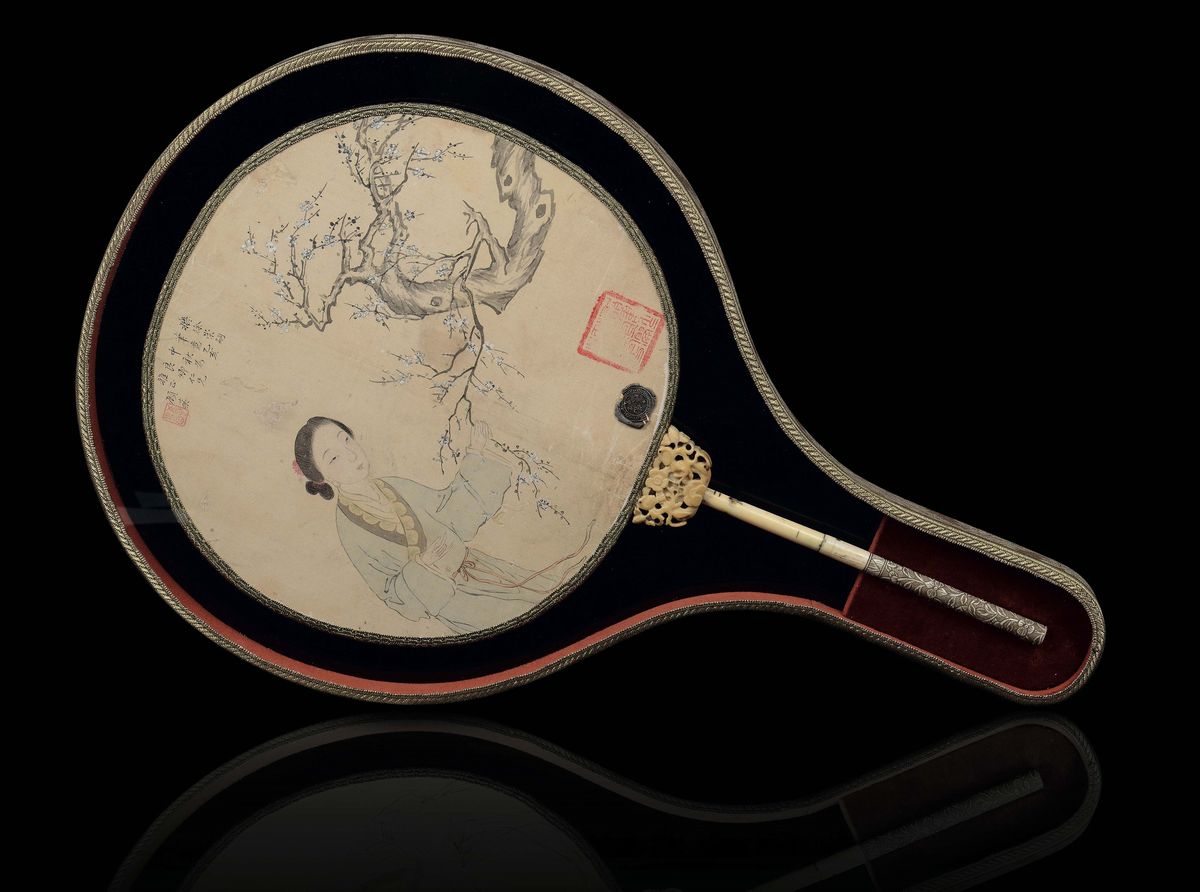 Ventaglio dipinto con Guanyin ed iscrizioni e paesaggio non coevo, con manico in avorio, Cina, Dinastia Qing, XVIII/XIX [..]