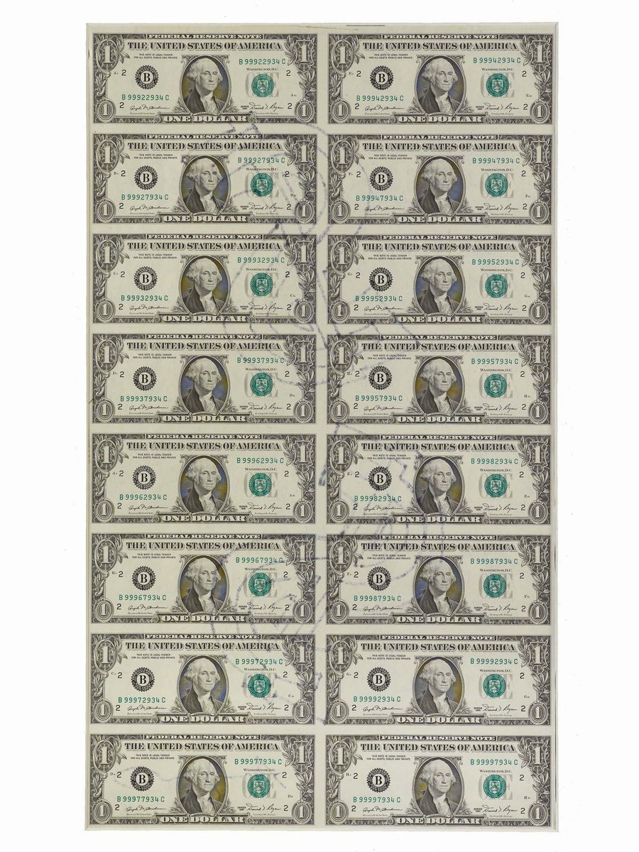 foglio di 16 banconote da 1 dollaro firmate Andy Warhol in basso a destra e due grandi “$” al centro, cm 31,4x53,6