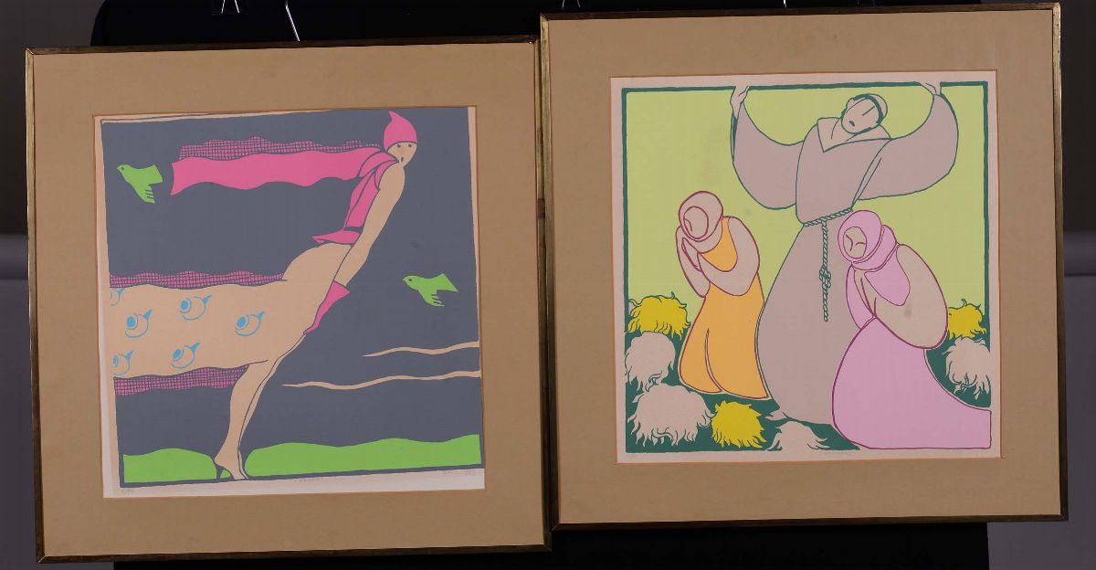 cm 63x63, es. 5/50 e p.a. coppia di litografie, 1929, in cornici in noce