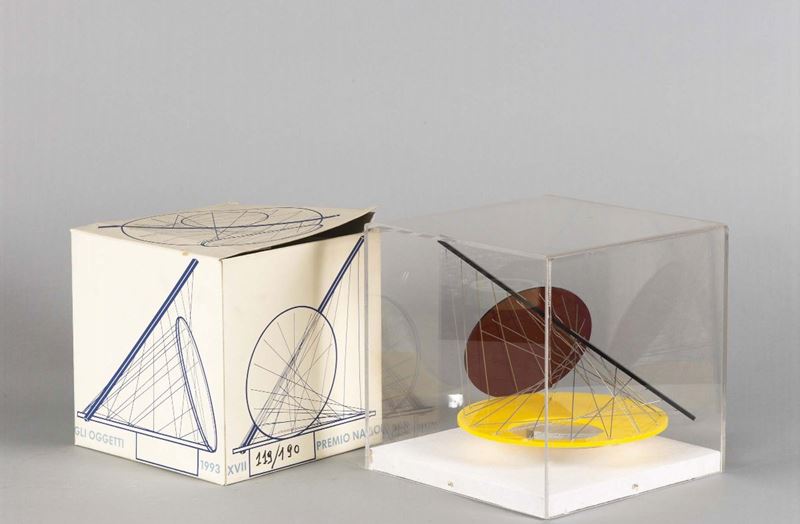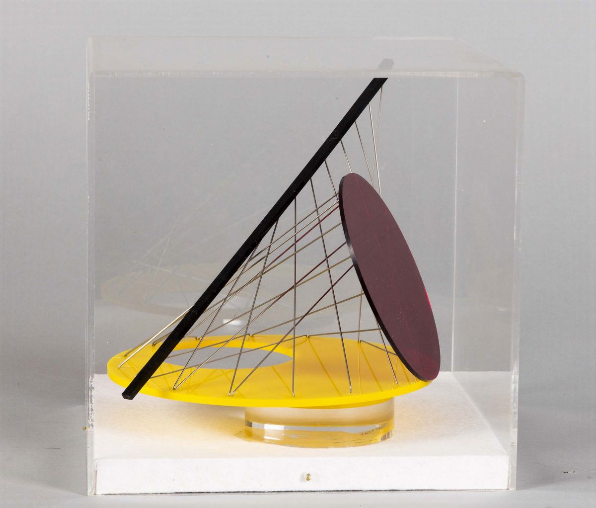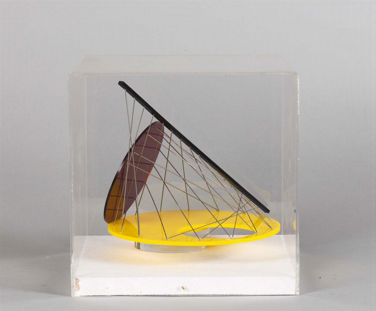 scultura in perspex trasparente e perspex giallo, rosso, nero e aste di acciaio inox, cm 23x21x25Es.119/190Certificato di garanzia e autenticità
