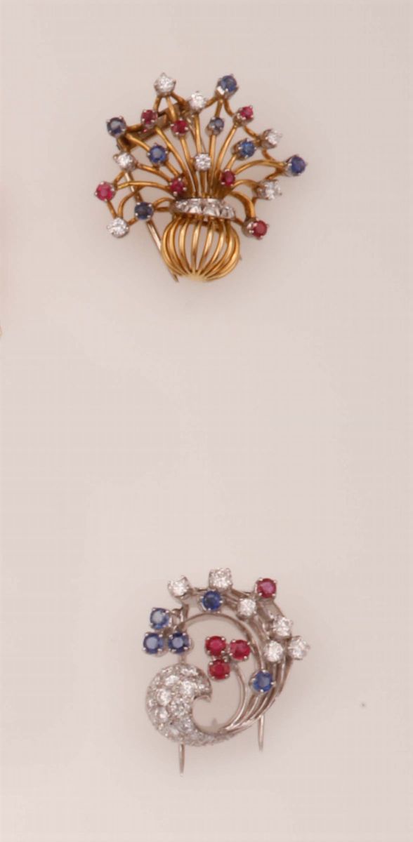Lotto composto da due clips con diamanti, zaffiri e rubini