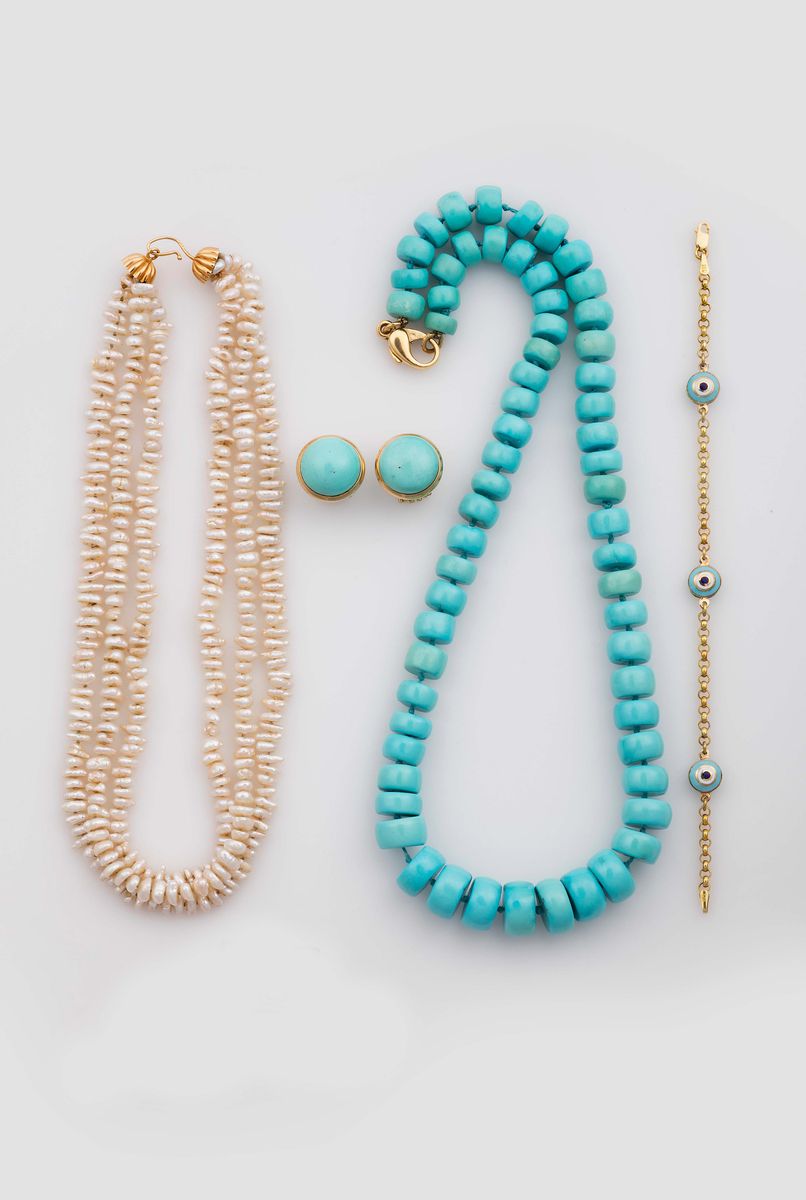 Lotto composto da un girocollo con perle d’acqua dolce, un girocollo con turchese Arizona trattato, un bracciale con smalti ed un paio di orecchini con turchese