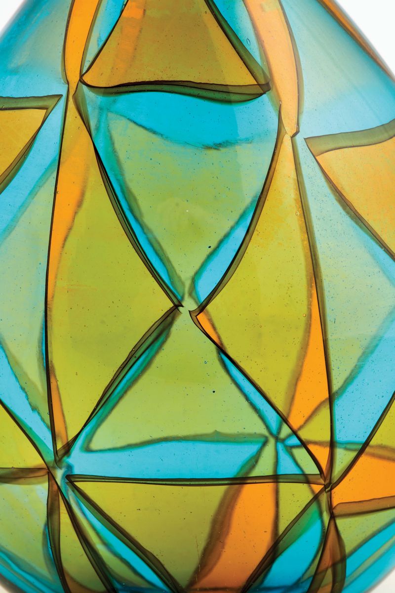 Vaso ovoidale con collo allungato decorato con tessere triangolari in vetro giallo-turchese.