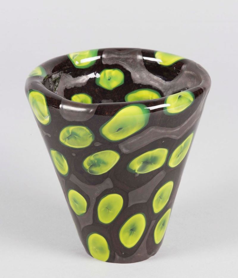 Vaso troncoconico in pasta vitrea violacea con decoro di murrine giallo-verdi.