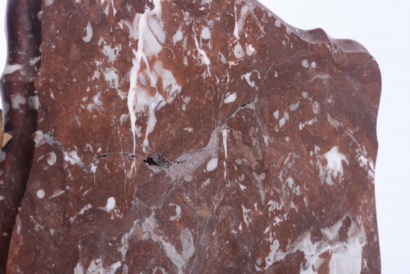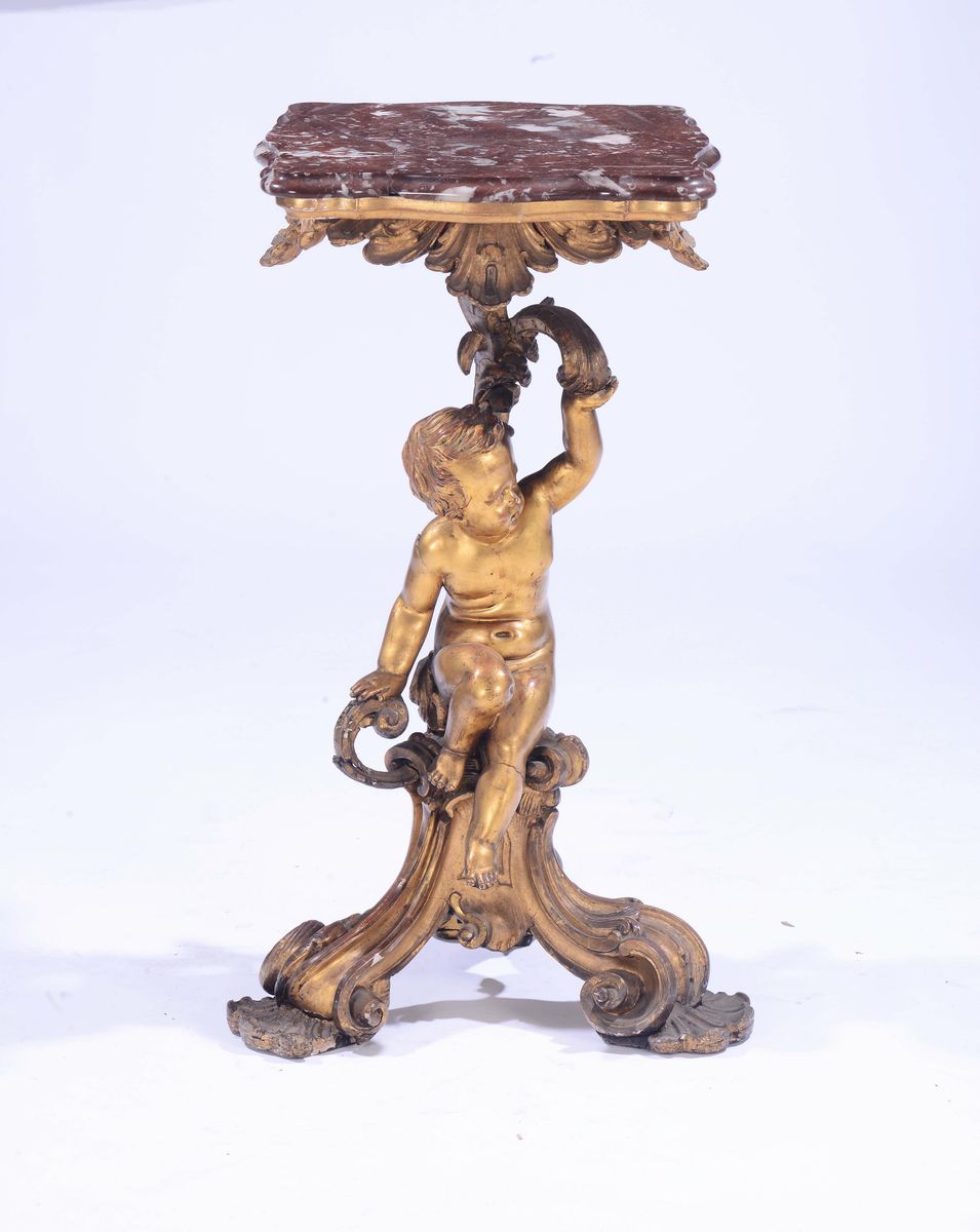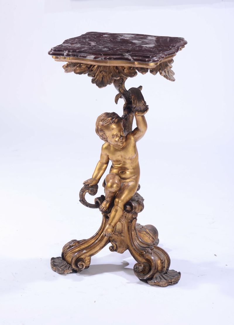 fusto centrale a guisa di putto seduto su base terminante con tre gambe a ricciolo, piano in marmo sagomato, cm 41x41x83,5 (difetti)