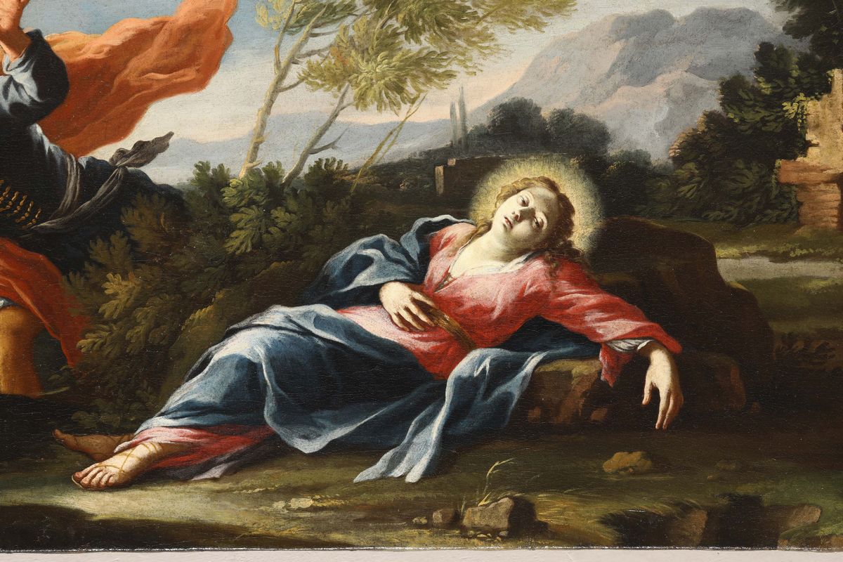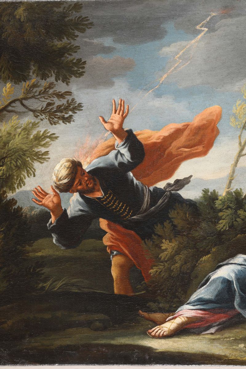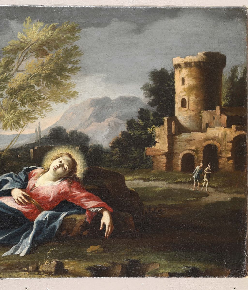 Expertise di Sandro Bellesi. [...] Proveniente da una collezione ab antiquo oggi sconosciuta, la tela, in ottimo stato di conservazione, presenta, entro un ameno paesaggio campestre nel quale compare un rudere con una torre a pianta circolare, le figure di una giovane donna riversa al suolo, con la testa alonata da un'aureola divina, e di un uomo con abiti di foggia orientale, descritto con le braccia alzate e in atto di essere colpito da un fulmine. In base alla presenza della torre e del fulmine è possibile riconoscere nel personaggio muliebre un'immagine di santa Barbara [...] Frutto di un linguaggio stilistico erudito ricco di raffinato eclettismo, il dipinto presenta caratteri stilistici fiorentini del primo Settecento con interessanti aperture e meditazioni sulle correnti bolognesi del tempo. In base alla tipologia delle figure e alla resa pittorica è possibile riferire il dipinto al nome di Francesco Soderini, maestro toscano di indubbio charme [...]