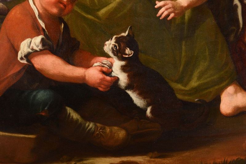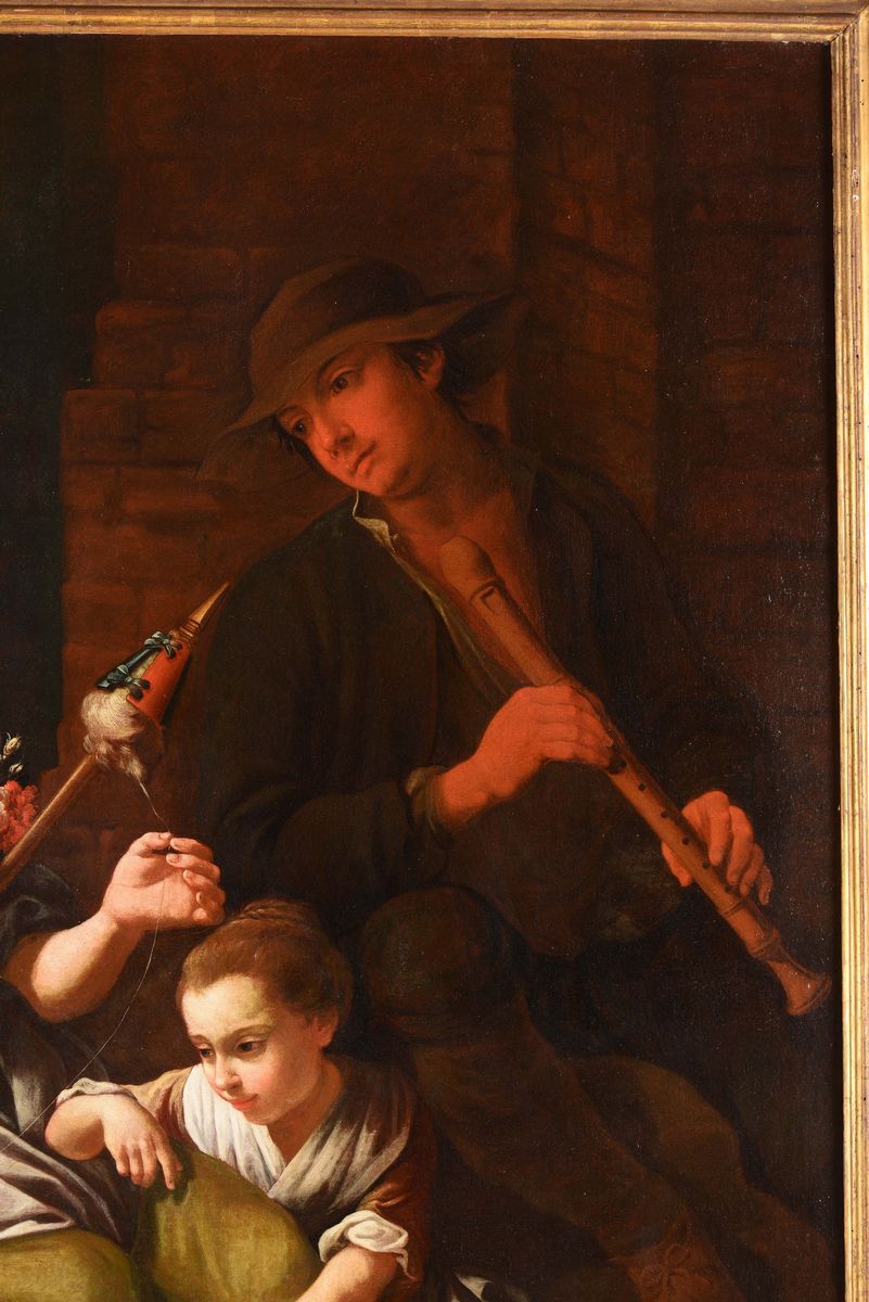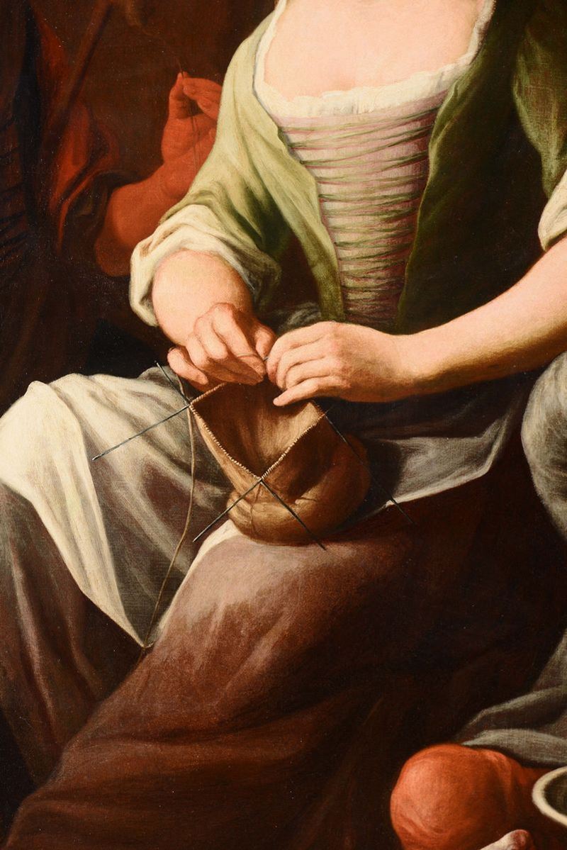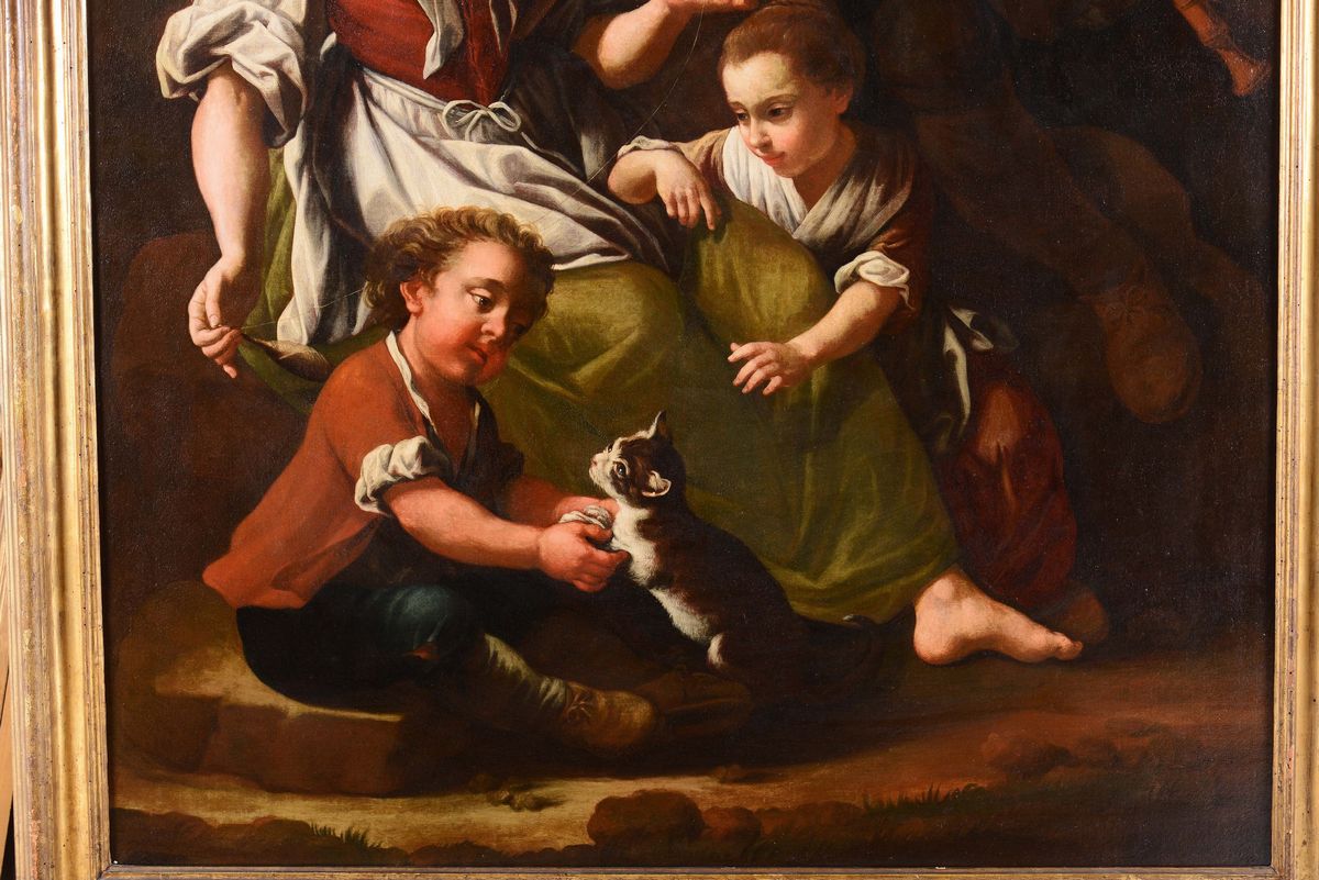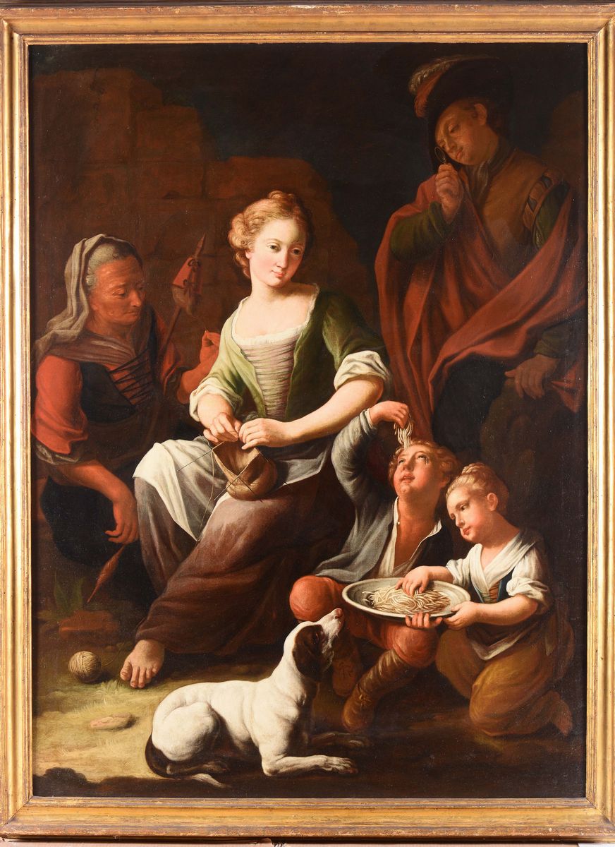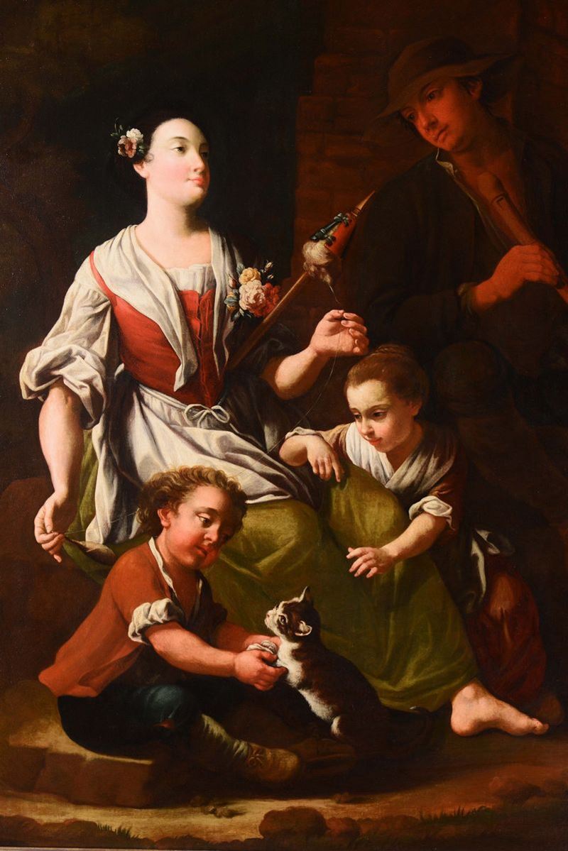 Giuseppe Gambarini (Bologna 1680 - Casalecchio di Reno 1725), attribuiti a Scene popolari con donna che cuce, due bambini [..]