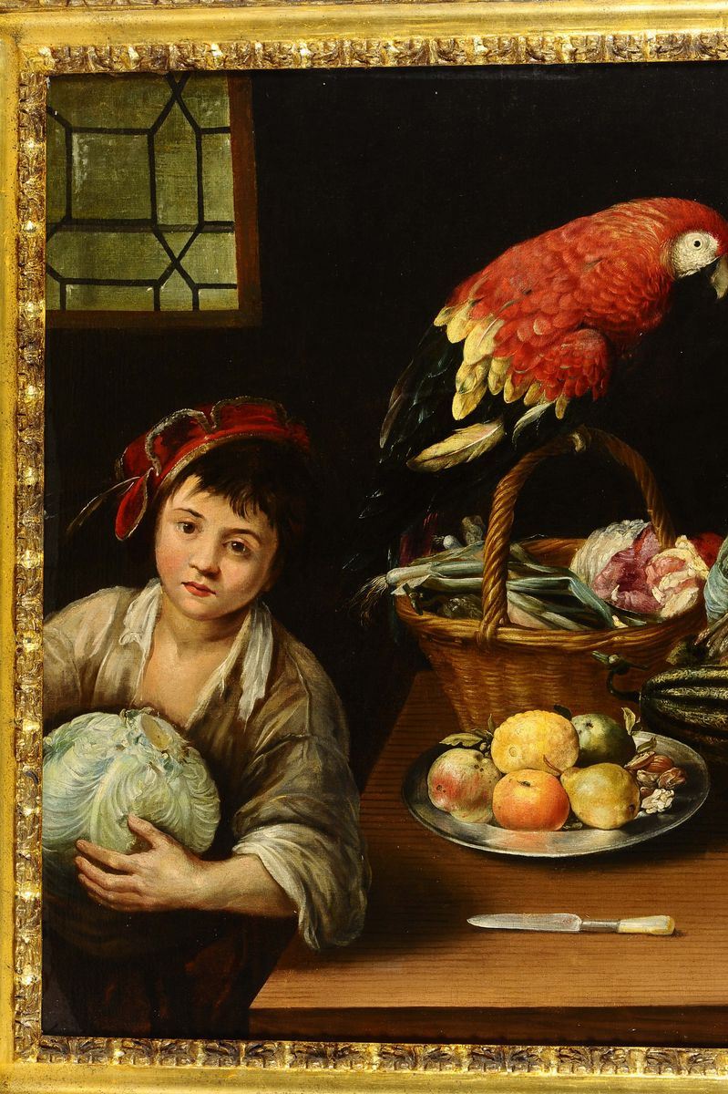 Pieter Van Boucle (Parigi 1610-1673) Interno di cucina con garzone e pappagallo