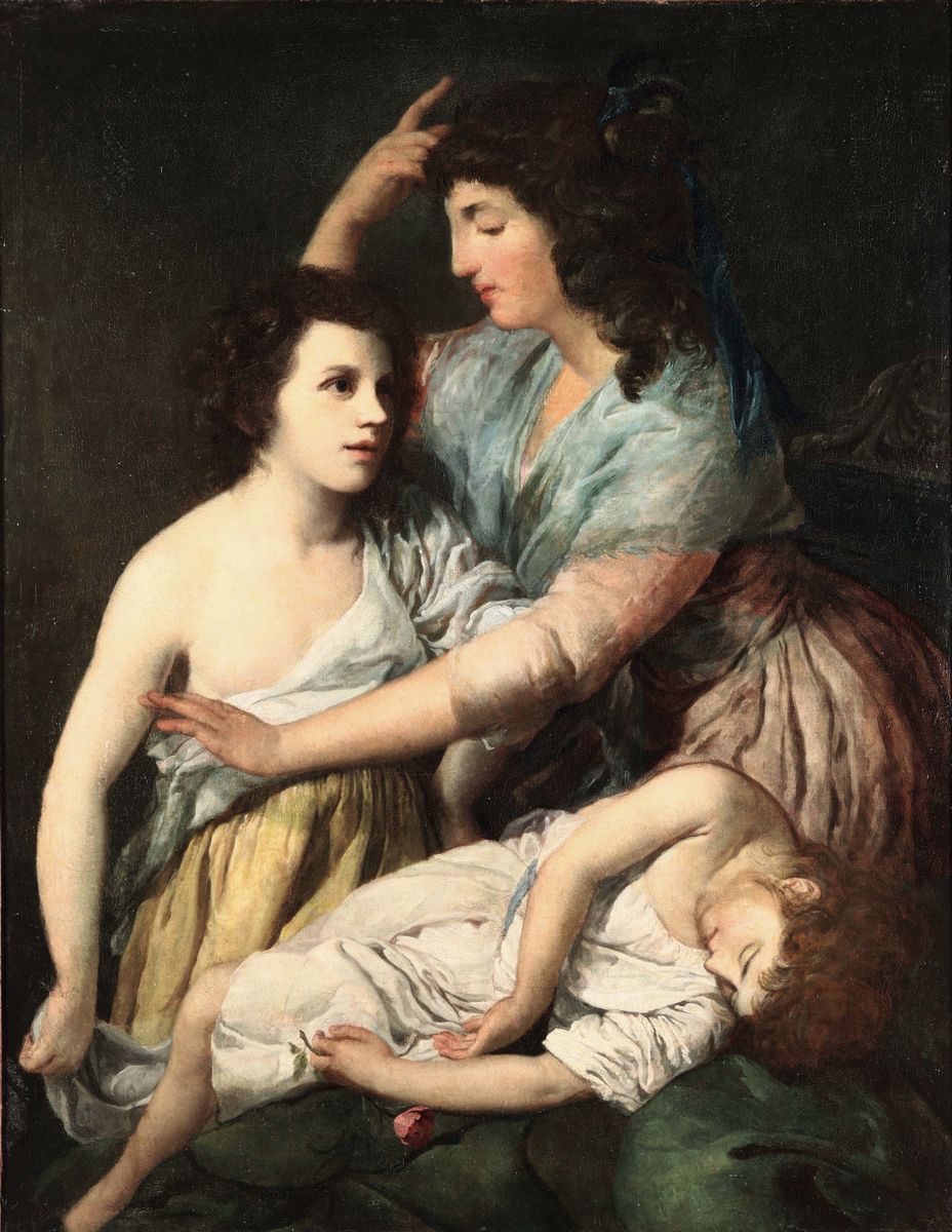 Scuola della fine del XVII secolo Figura femminile con due bambini