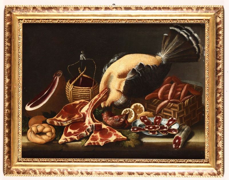 Scuola emiliana del XVIII secolo Natura morta con cacciagione e carne