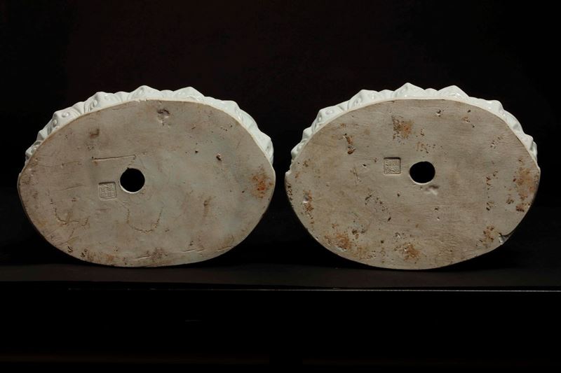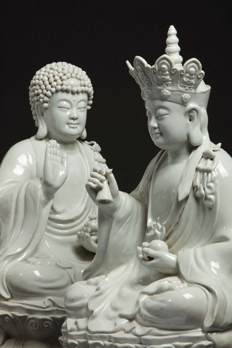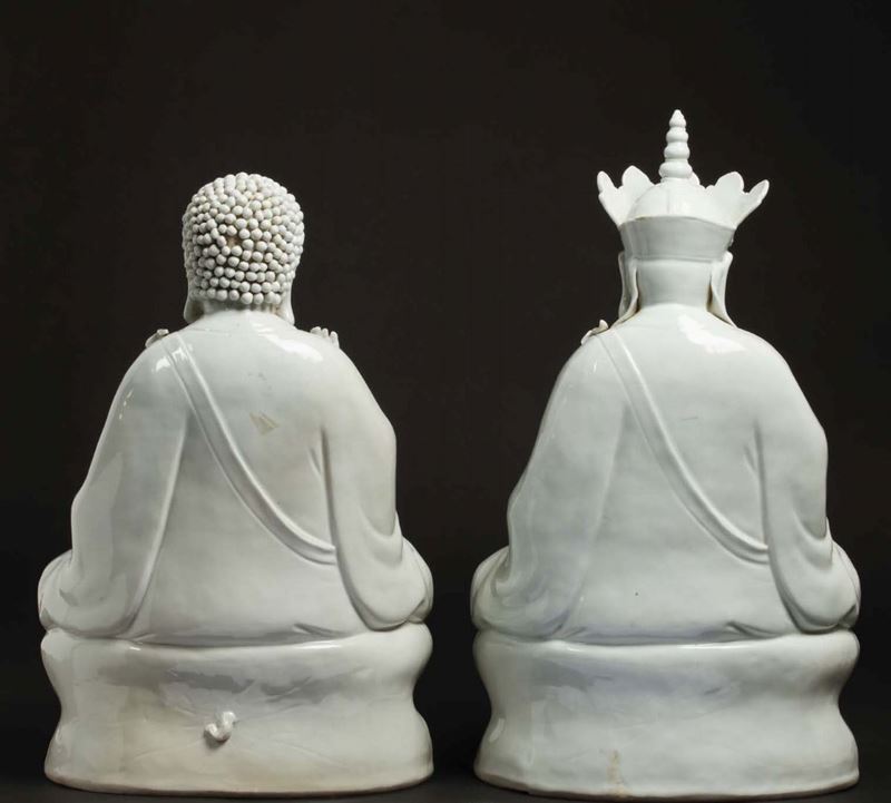 Due figure di Buddha in porcellana Blanc De Chine sedute su doppio fiore di loto, Cina, XX secolo