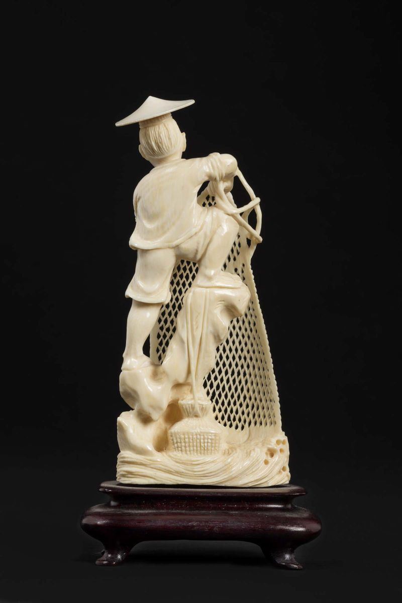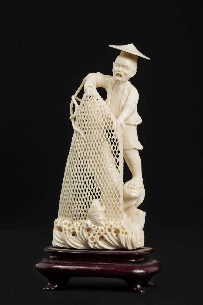 Figura di pescatore scolpito in avorio con rete, Giappone, inizio XX secolo