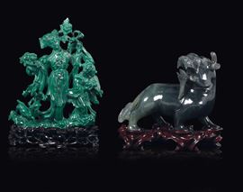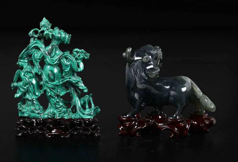 Lotto composto da una figura di Guanyin in malachite ed un cane di Pho in giada grigia, Cina, XX secolo