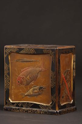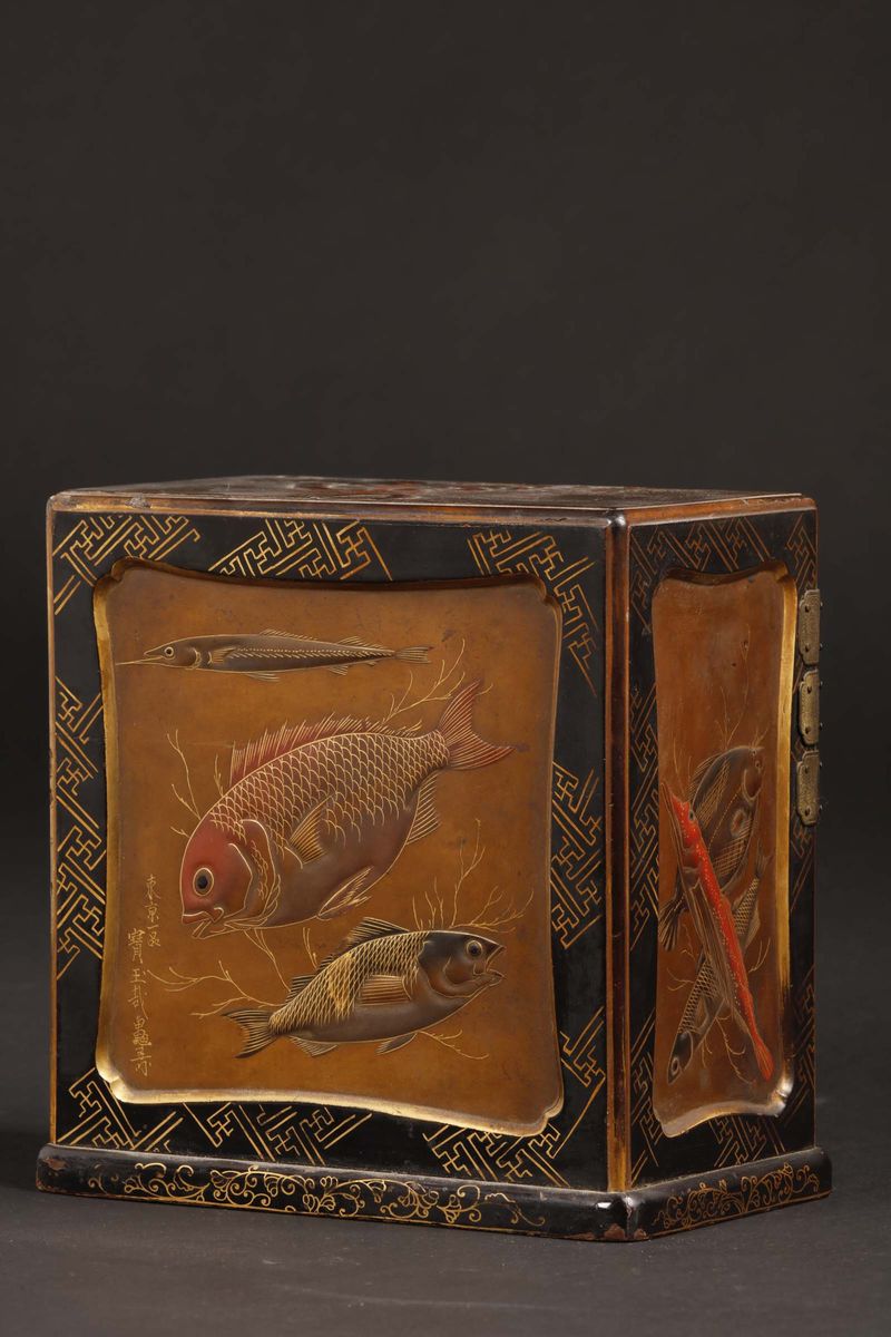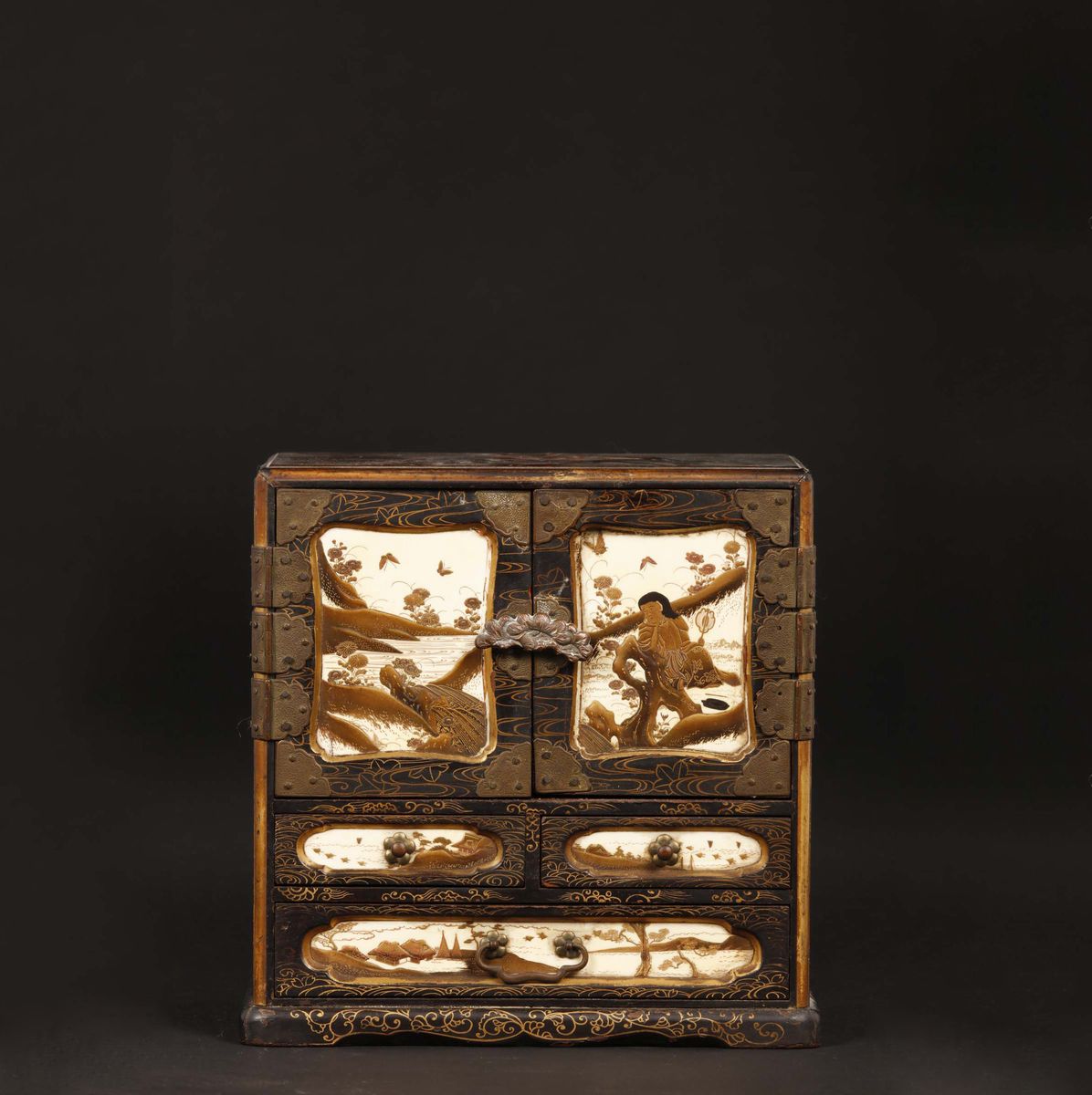 Mobiletto in legno laccato con pannelli Shibayama, Giappone, inizio XX secolo
