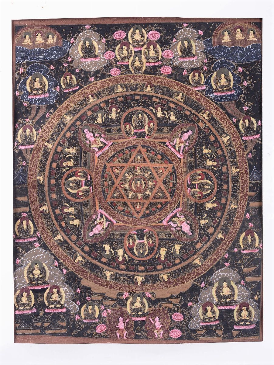 Tanka raffigurante diverse divinita con Mandala centrale, Tibet, XIX secolo