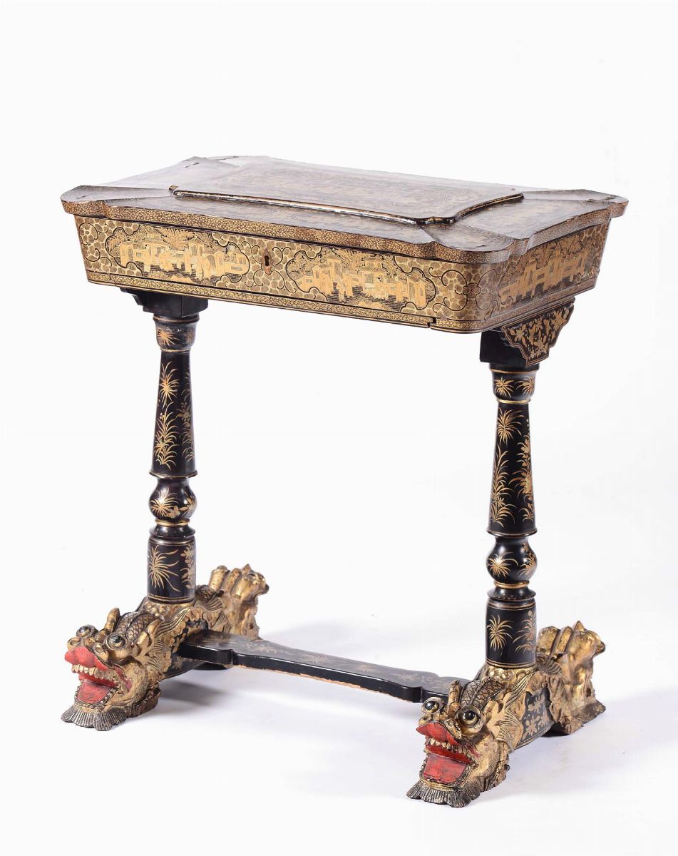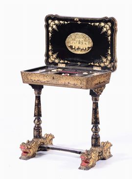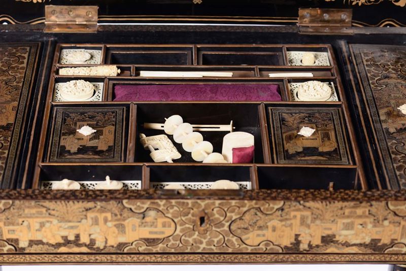 Tavolino in legno laccato contenente oggetti da ricamo in avorio, Cina, Dinastia Qing, fine XIX secolo