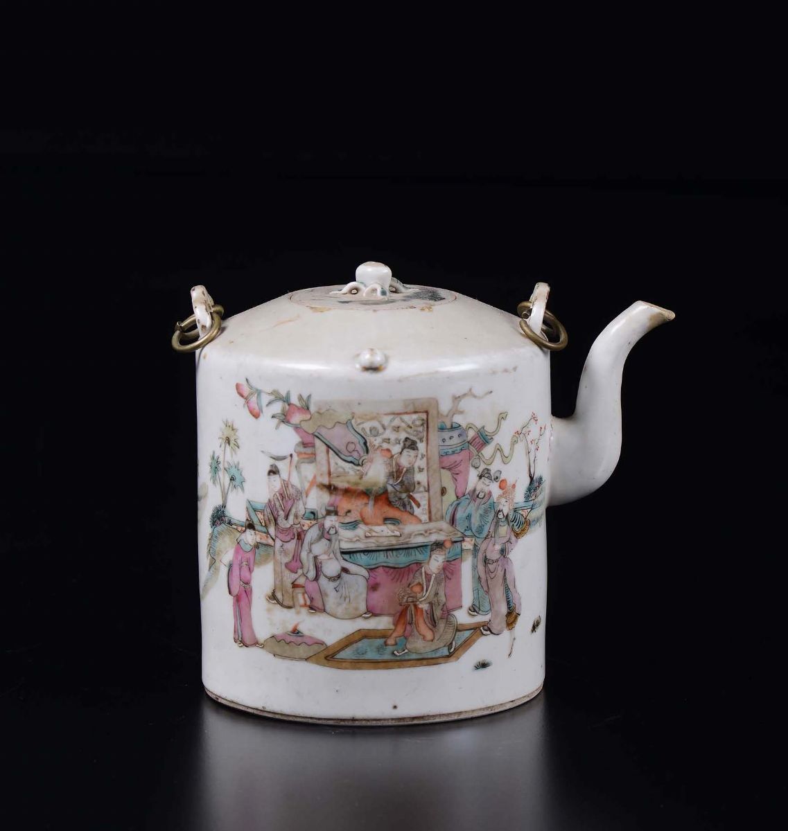 Teiera in porcellana a smalti policromi con personaggi, Cina, Dinastia Qing, fine XIX secolo