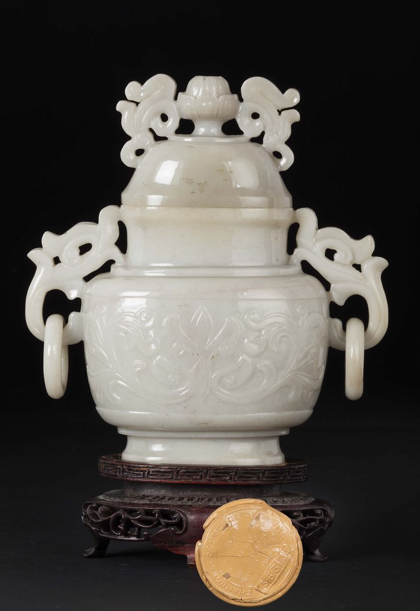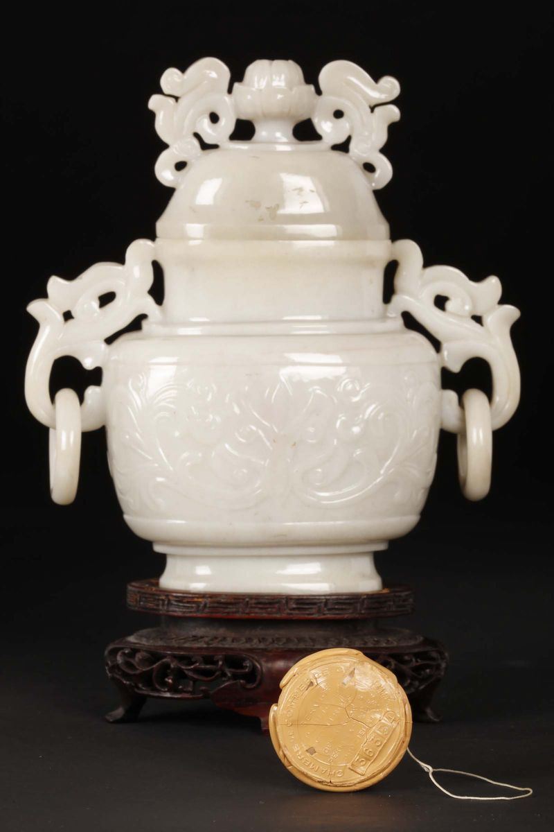 Vasetto in giada bianca con coperchio con decoro di gusto arcaico, Cina, inizio XX secolo