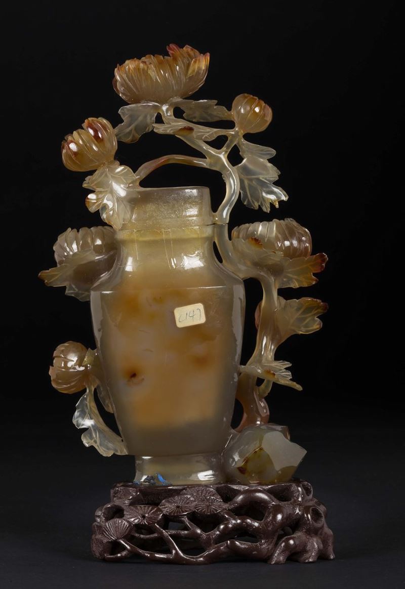 Vaso con coperchio scolpito in agata con fiori a rilievo, Cina, XX secolo