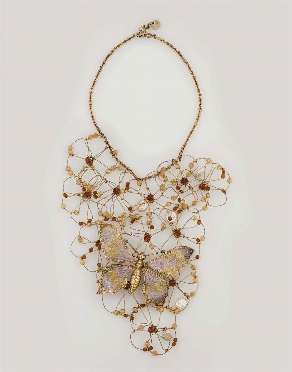 metallo dorato, farfalla smaltata a mano, perle di imitazione, pietre di pasta di vetro, firmato, cm 34