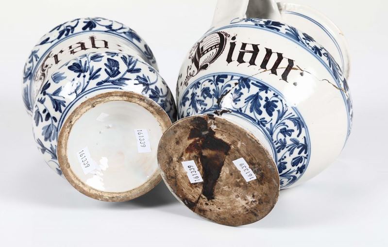 Maiolica a gran fuoco, altezza cm. 18.8 e 19,5 circaAbrasione all’albarello, rottura al boccale