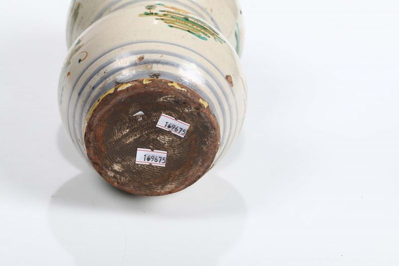 Albarello in maiolica decorato in policromia fondo crema, Italia centrale fine XVIII secolo