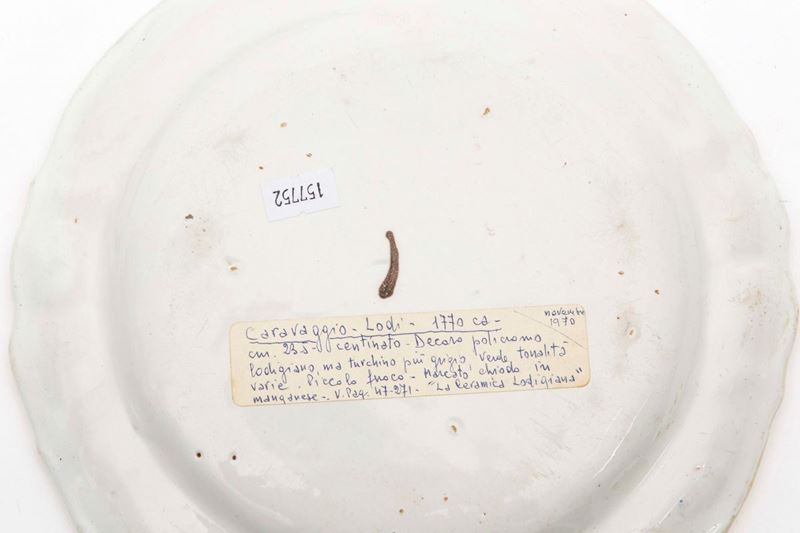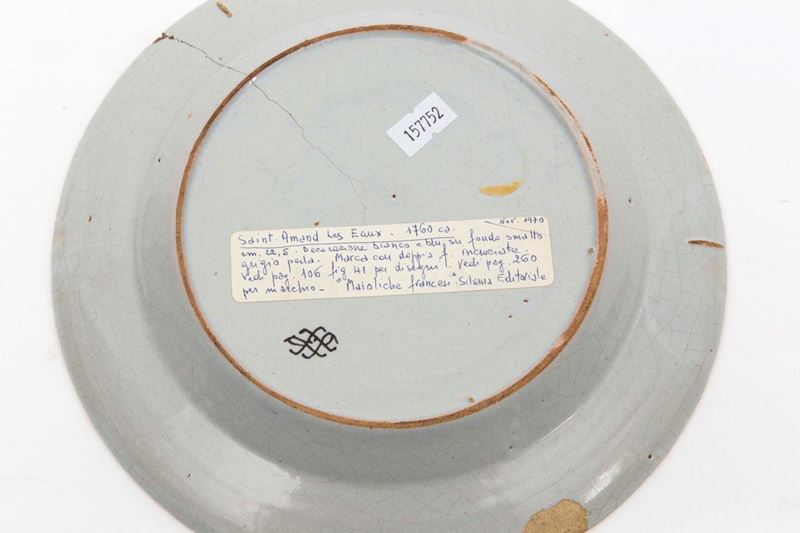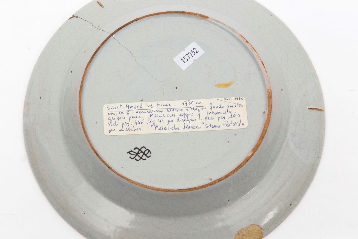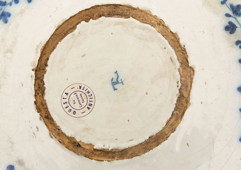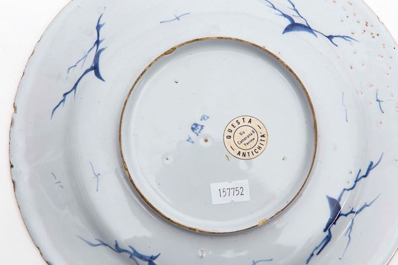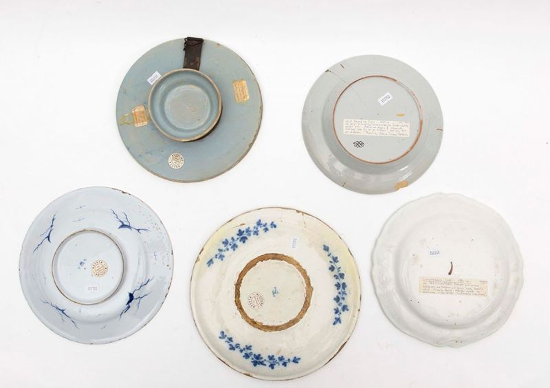 tra cui piatto francese a decoro bianco e blu su fondo grigio perla, diametro cm 22,5, piatto Lodi a decoro policromo cm 23,5, alzata Fabbrica Manardi Angarano, cm 23,5, piattino bianco e blu con figura di guerriero, Albisola marca Reale, cm 24,e e alzata senza base bianca e blu, cm 26,5 (rotture)