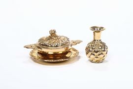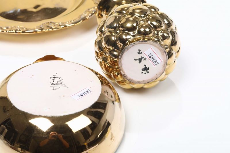 Due oggetti, zuppierina e vasetto a bottiglia di gusto settecentesco in maiolica dorata, manifattura italiana, anni 30 del [..]