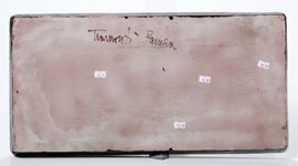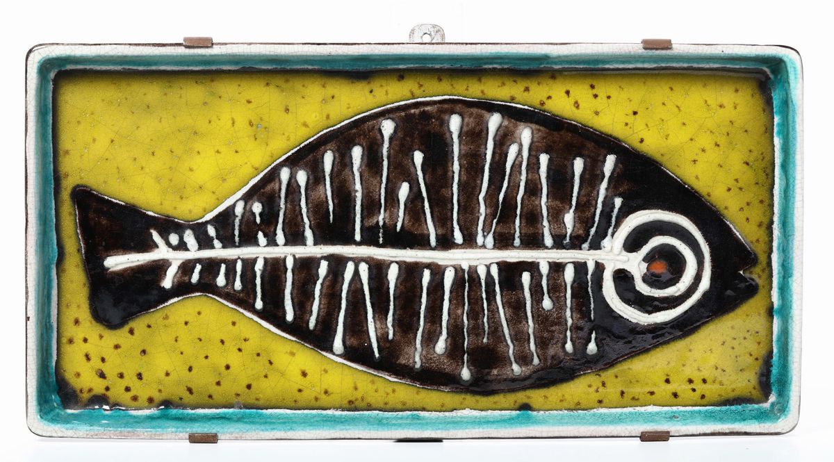 Vassoio con pesce stilizzato, ceramica policroma a lustro, firma al retro