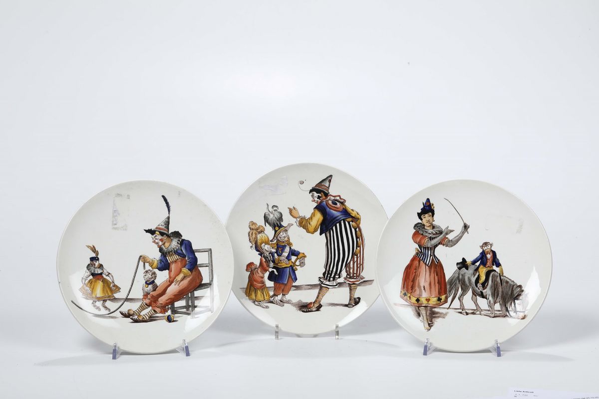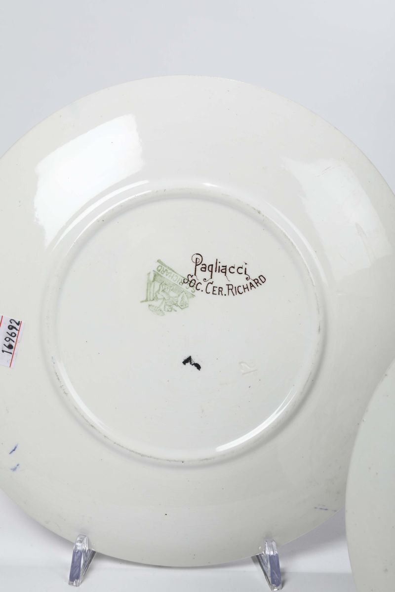 Lotto composto da tre piatti in ceramica della serie “i pagliacci”, marcate società ceramiche Richard. Anni 20 del 900 e un piatto in ceramica della serie Fortuna marcato società ceramiche Richard. Anni 20-30 del '900.