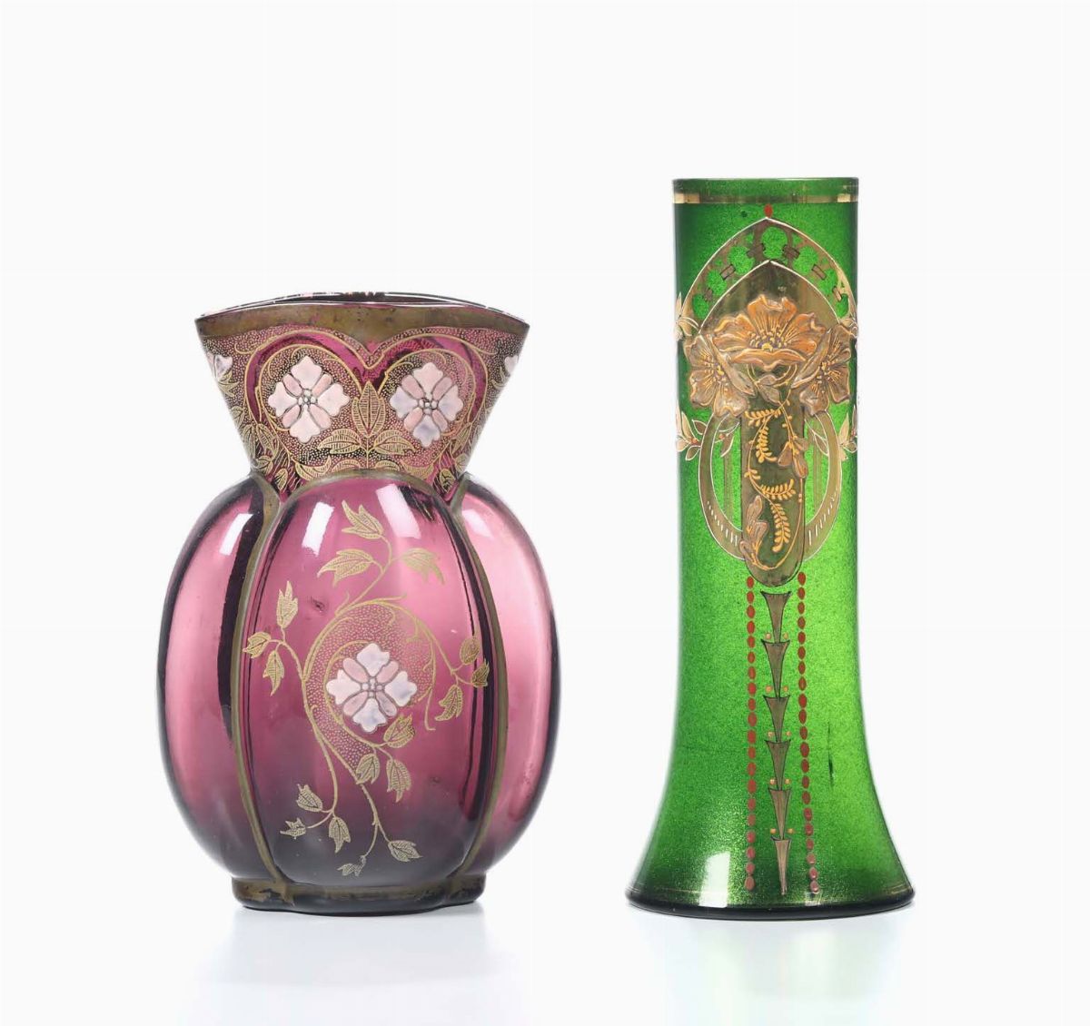 Lotto di due vasi in vetro, uno verde ed uno porpora con decori dorati