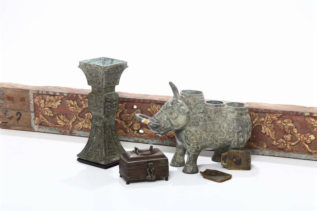 Lotto di oggetti etnici in legno, bronzo e altri materiali