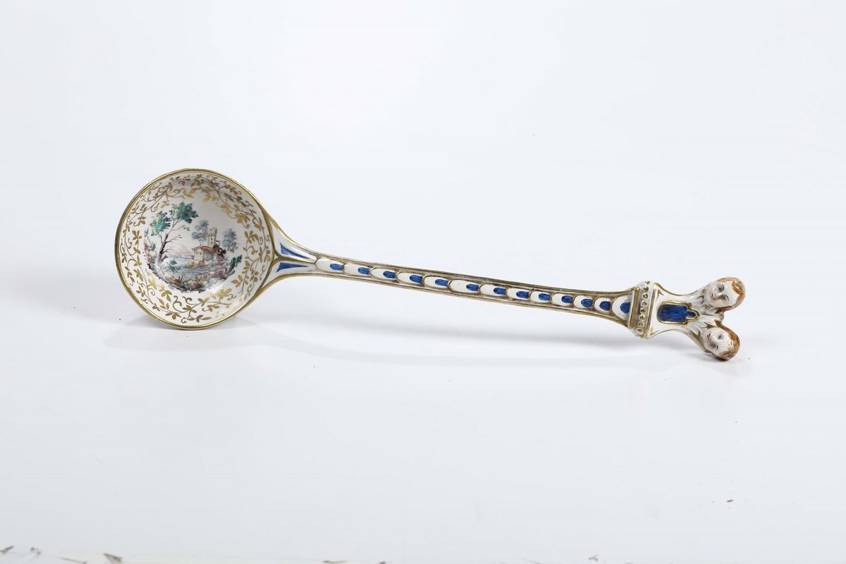 Mestolo in maiolica decoro al terzo fuoco in policromia con dorature,manifattura francese dell’Est XVIII secolo
